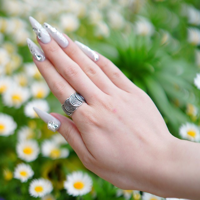 花などのボタニカルな雰囲気のスタンプが施されたリングです。スパイラル状のアシメントリーが特徴。軽い着け心地で、どんなスタイルにも合わせやすくマルチに付けて頂けます。 サイズ:13号(日本サイズ) 商品コード:R54