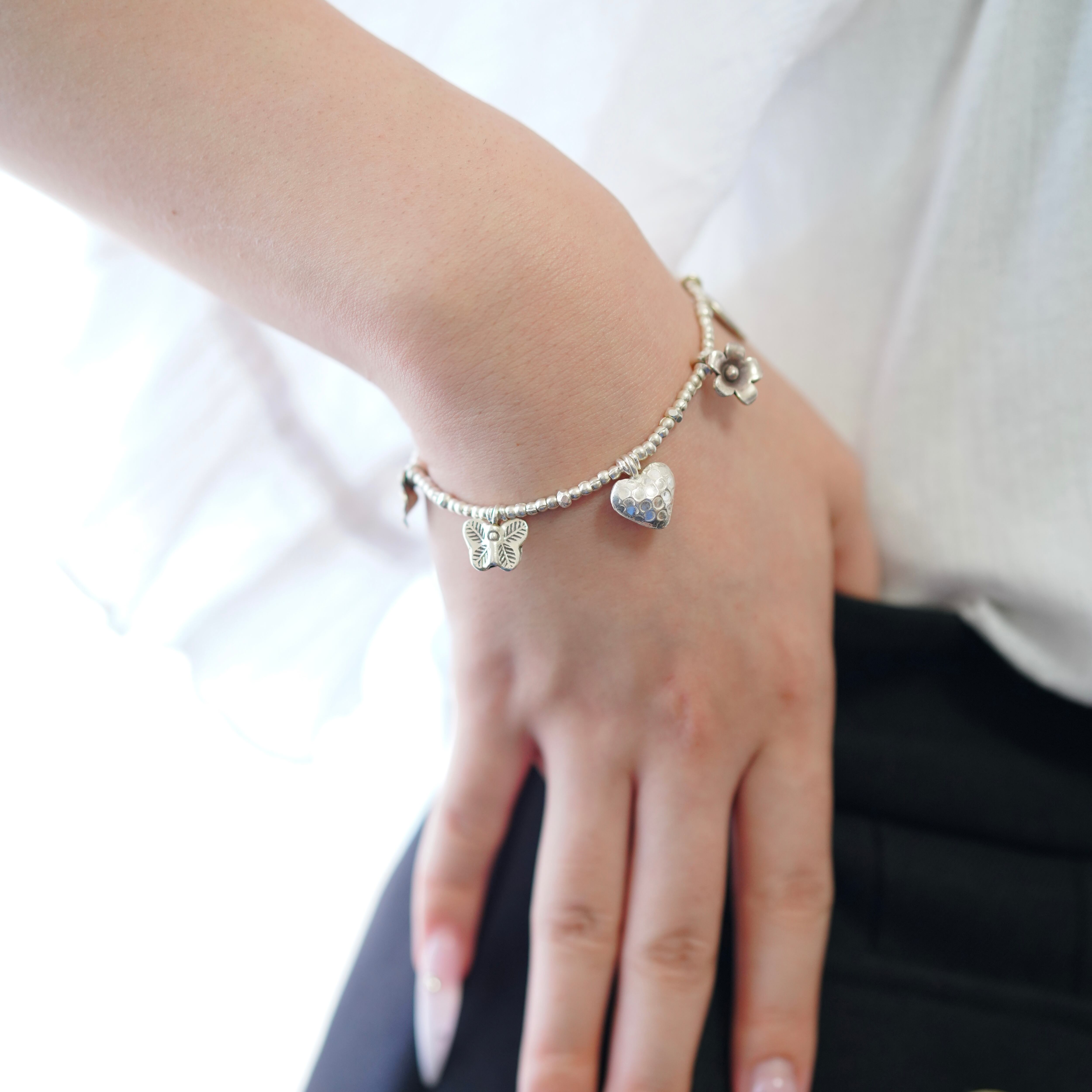 蝶や葉っぱ、ハートのチャームがついているアイテム。チャームがゆらゆらと揺れる可愛らしいアイテムです。時計やお手持ちのバングルと重ね付けしても相性抜群ですが、一つ付けでも魅力的なアイテムです。