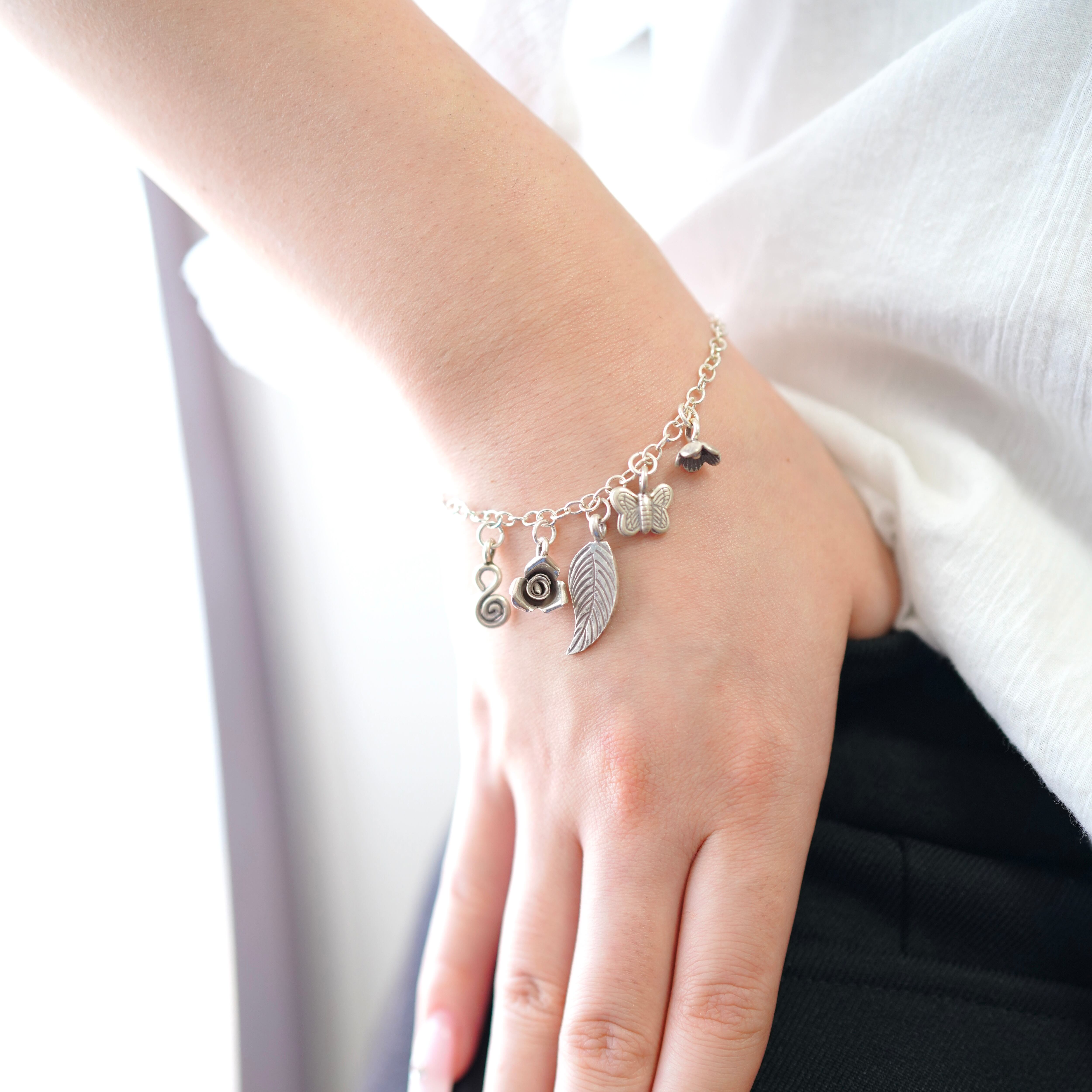 蝶や花などのチャームがついているアイテム。チャームがゆらゆらと揺れる可愛らしいアイテムです。時計やお手持ちのバングルと重ね付けしても相性抜群ですが、一つ付けでも魅力的なアイテムです。長さも調整してつけていただけます。