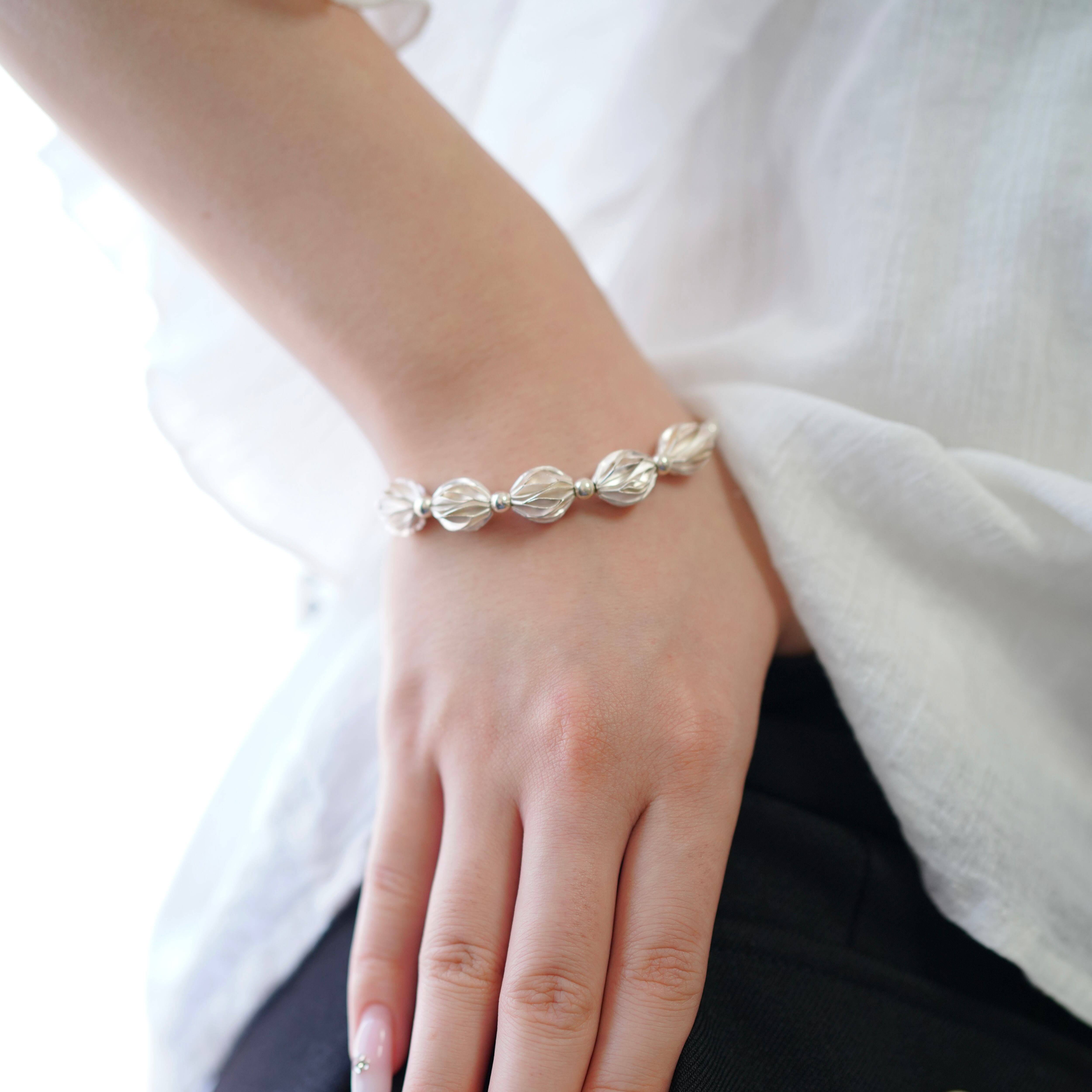 丸い形の模様がいているアイテム。長さも調整してつけていただけます。時計やお手持ちのバングルと重ね付けしても相性抜群ですが、一つ付けでも魅力的なアイテムです。チャームは可憐シルバーですが、チャーム部分は925となります。