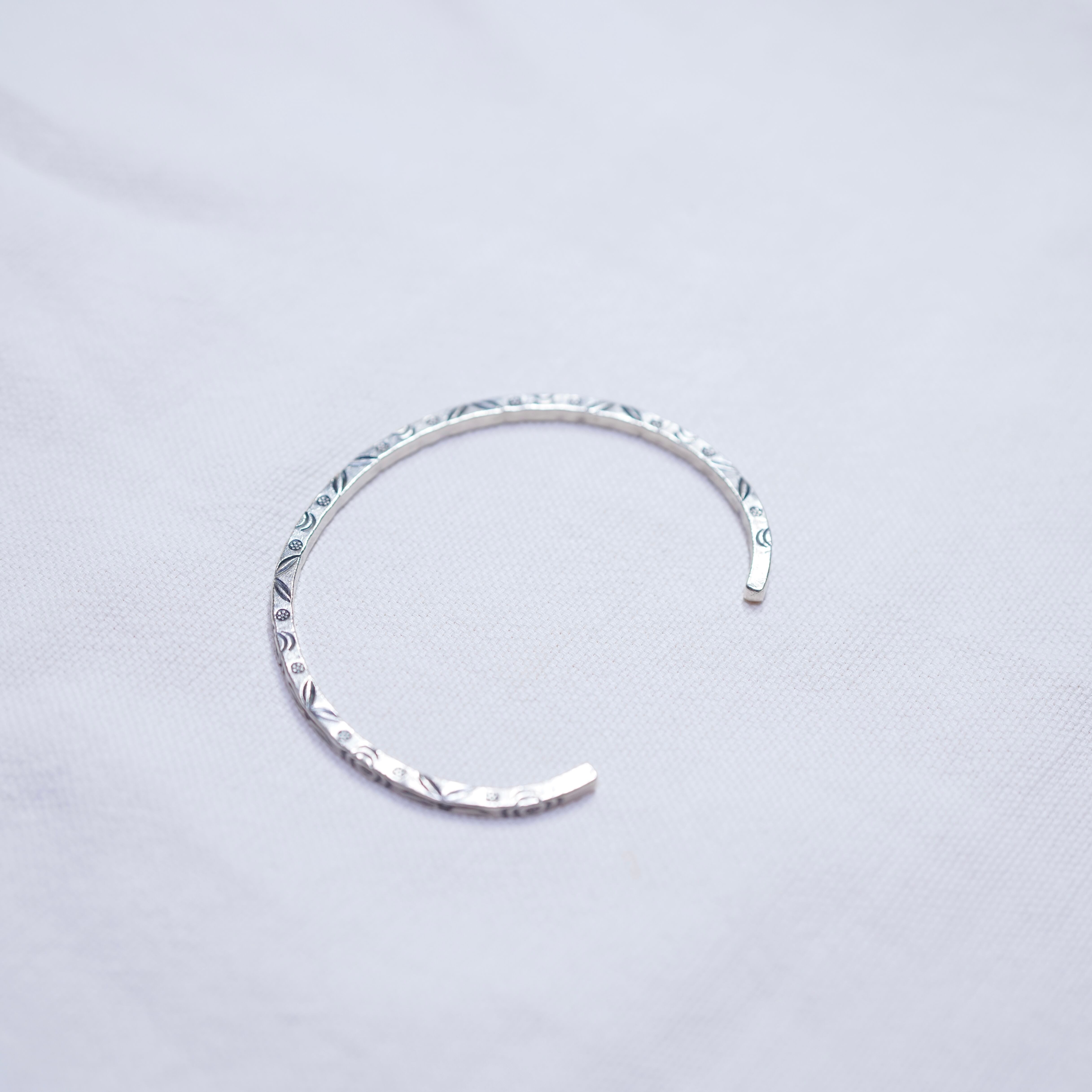 様々な柄のスタンプが施された細身のバングルです。細身なデザインのため普段使いのアクセントにぴったりなアイテムです。留め具がなく、ワンタッチで簡単に着脱できます。純度の高いシルバーを使用しておりやわらかい為、調整の際はお気を付け下さい。