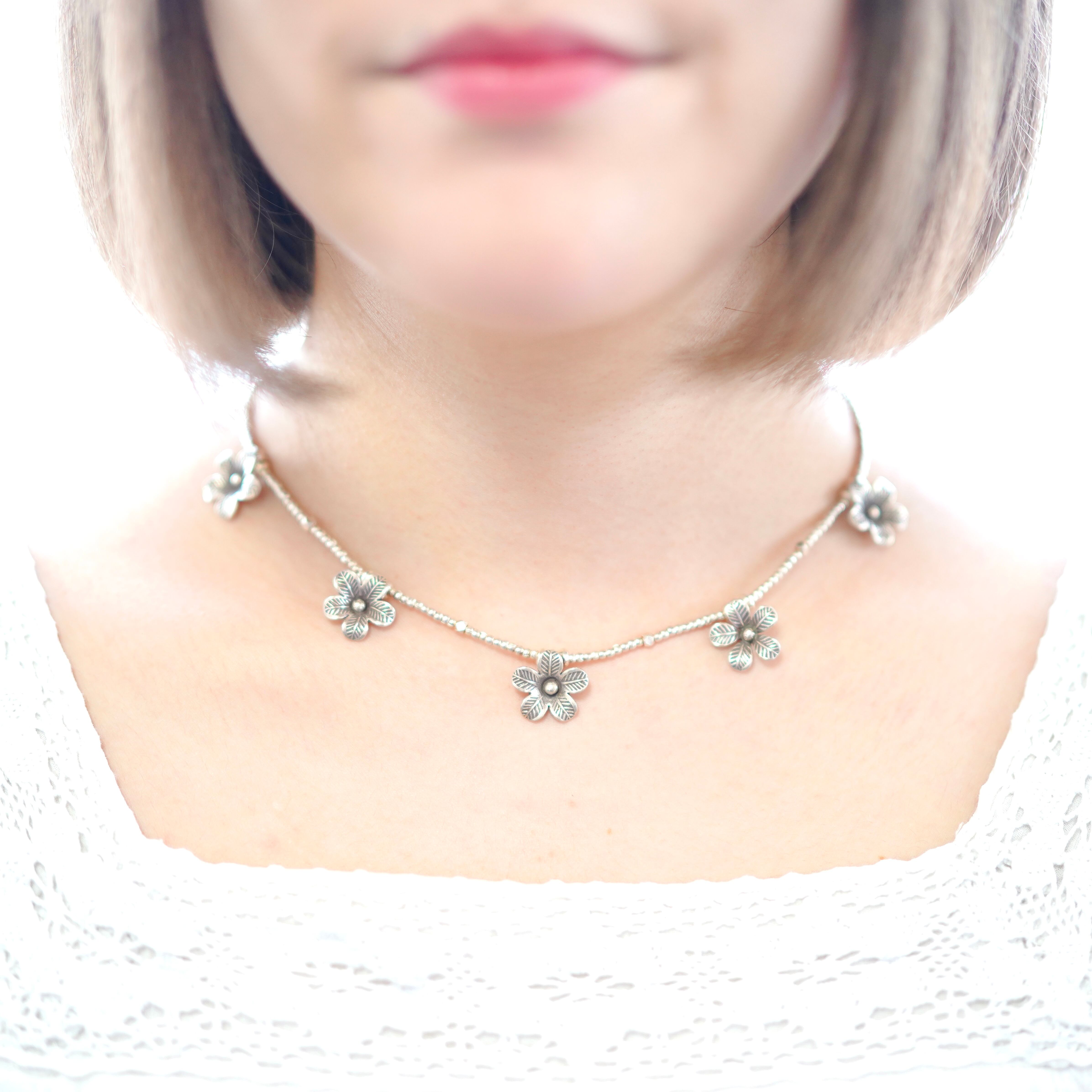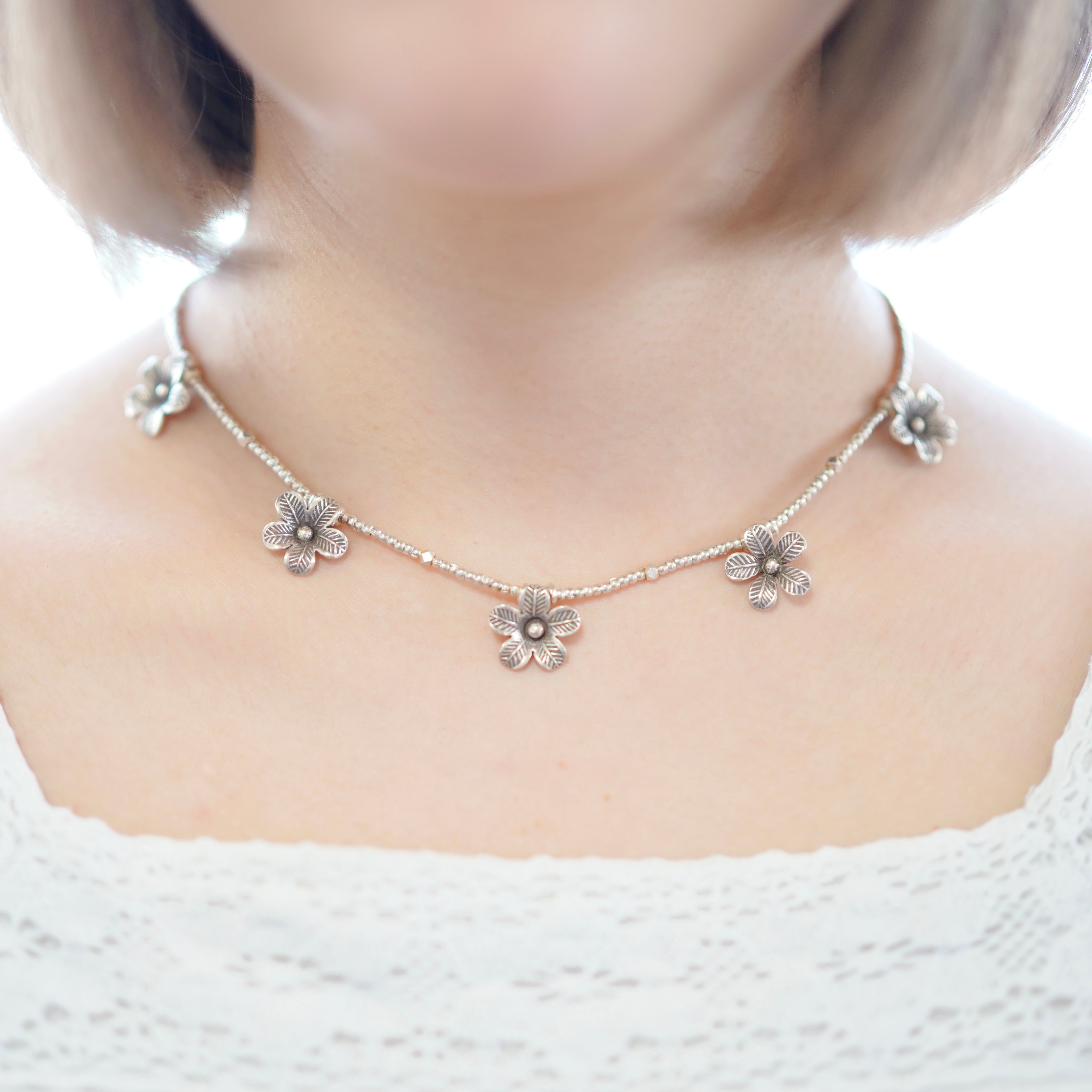 花のチャームが模された落ち着いた雰囲気のネックレスです。カレンシルバーならではの柔らかい質感が魅力的。スタイルを選ばず付けて頂けるアイテムです。