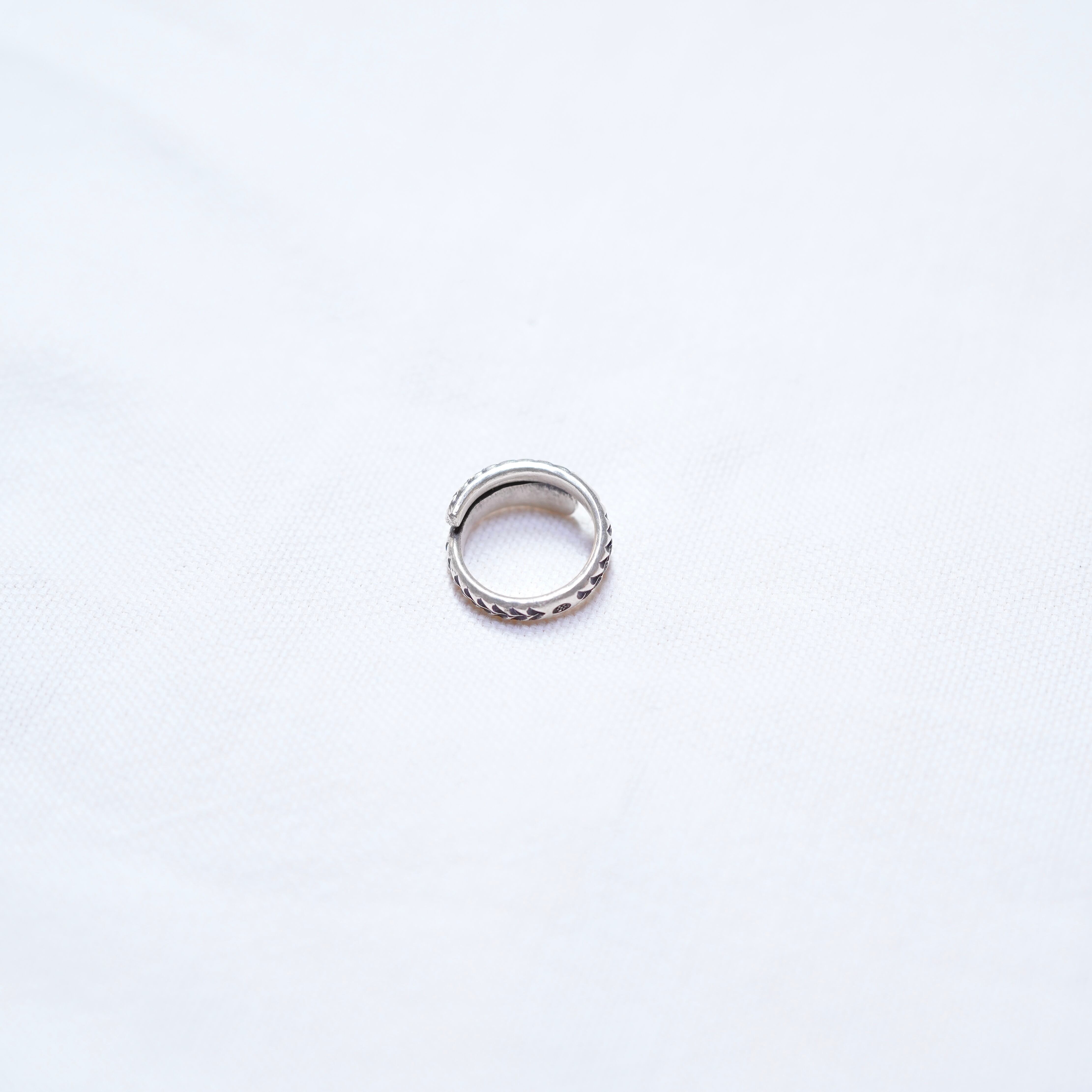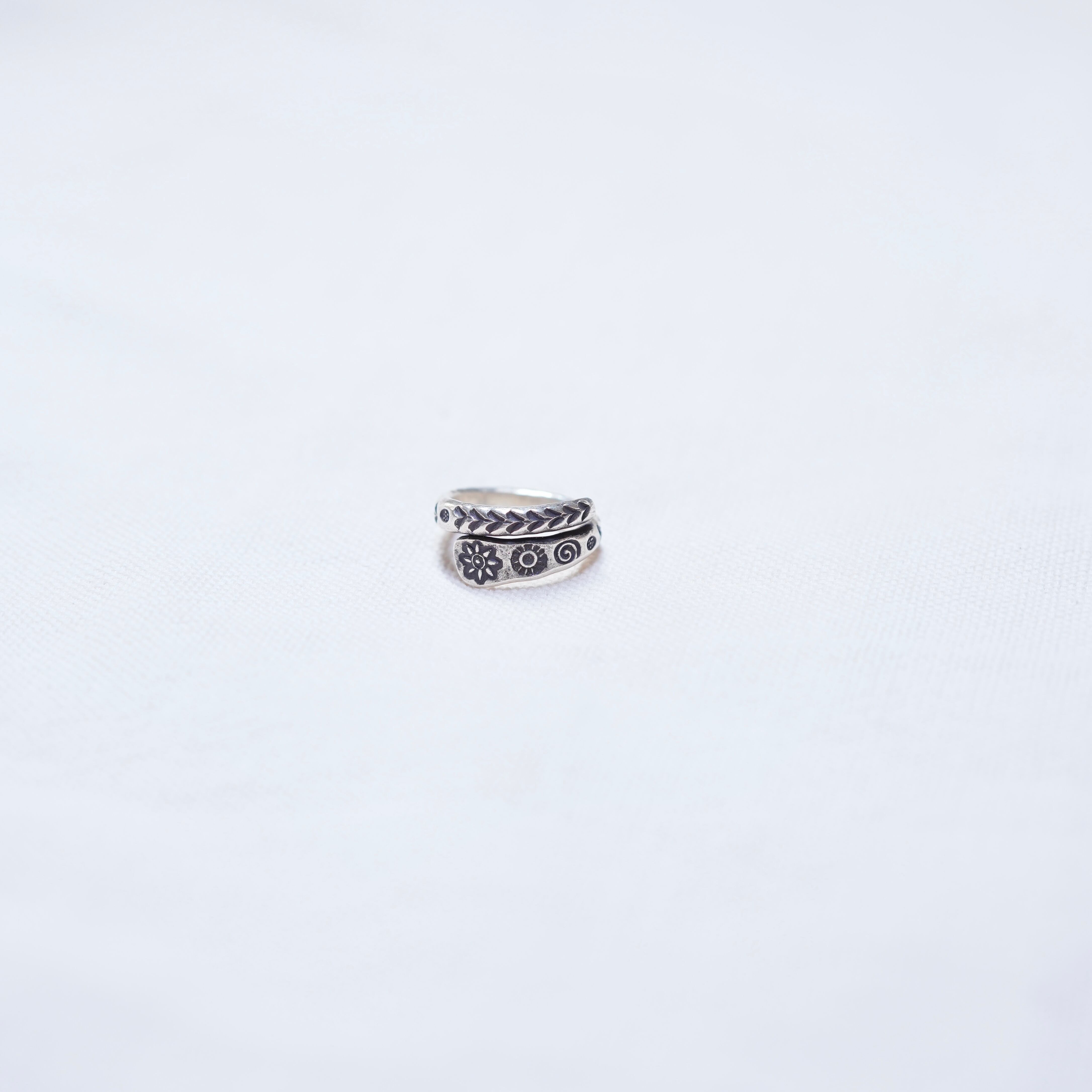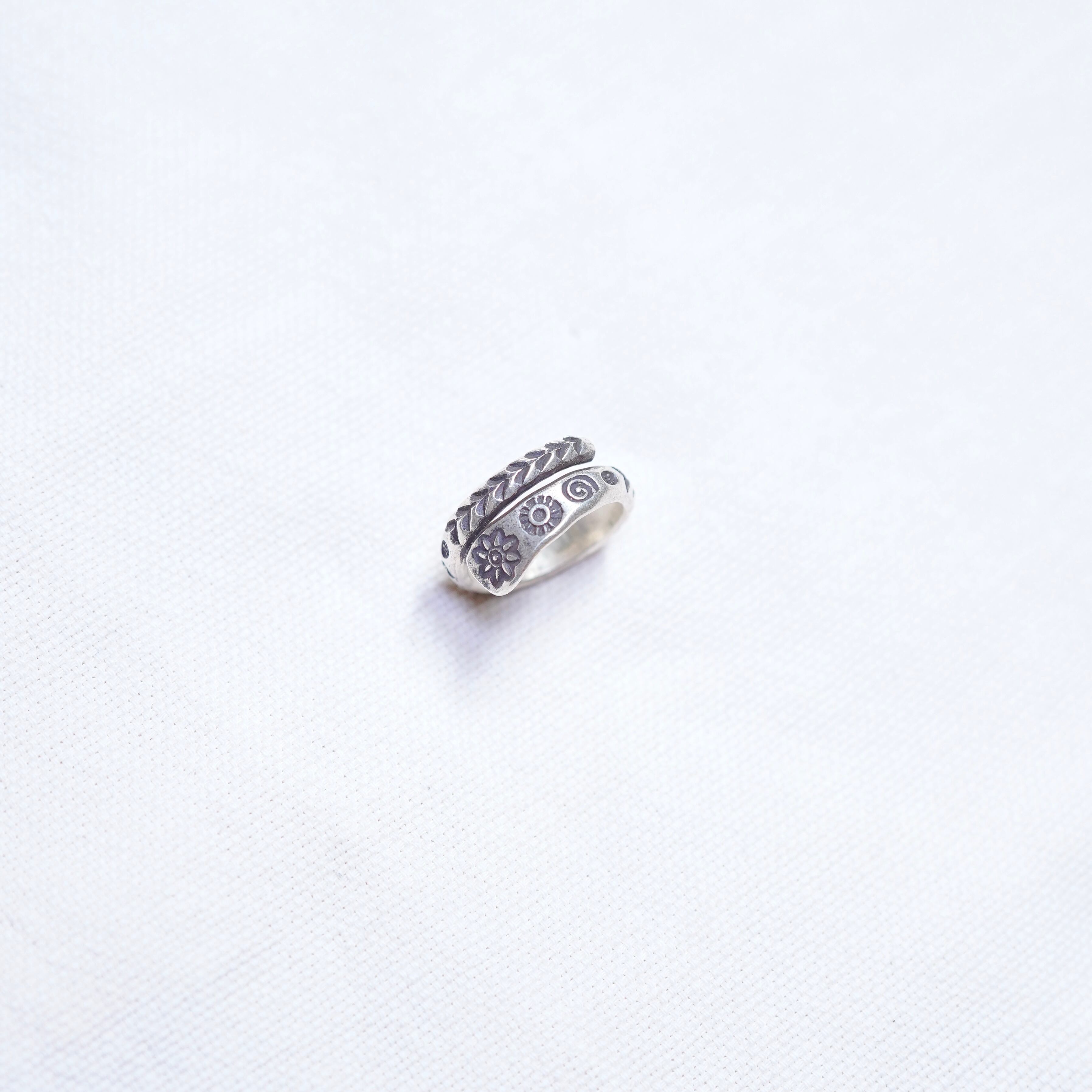 花などのボタニカルな雰囲気のスタンプが施されたリングです。スパイラル状のアシメントリーが特徴。軽い着け心地で、どんなスタイルにも合わせやすくマルチに付けて頂けます。純度の高いシルバーを使用しており、カレンシルバーらしいアイテムです。