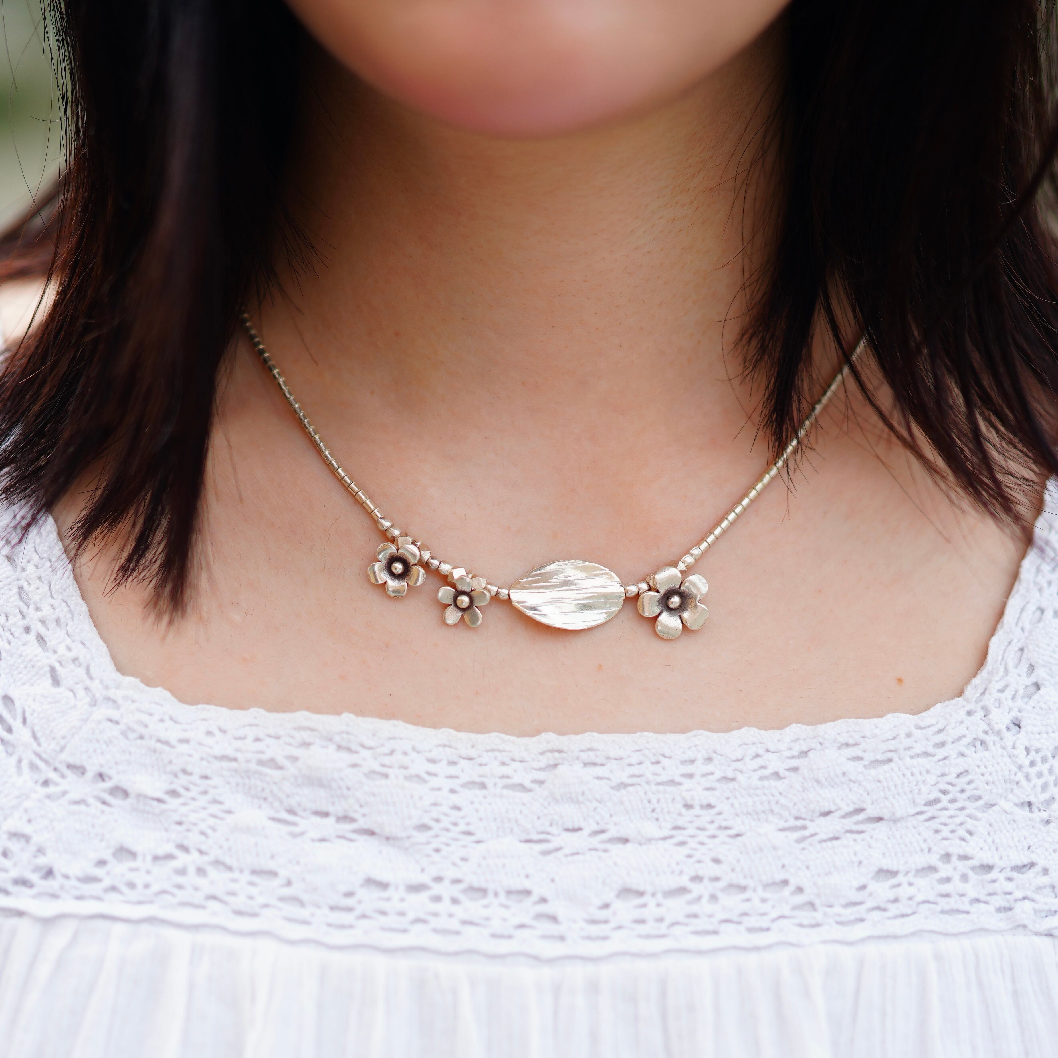 花や葉が模された落ち着いた雰囲気のネックレスです。カレンシルバーならではの柔らかい質感が魅力的。スタイルを選ばず付けて頂けるアイテムです。