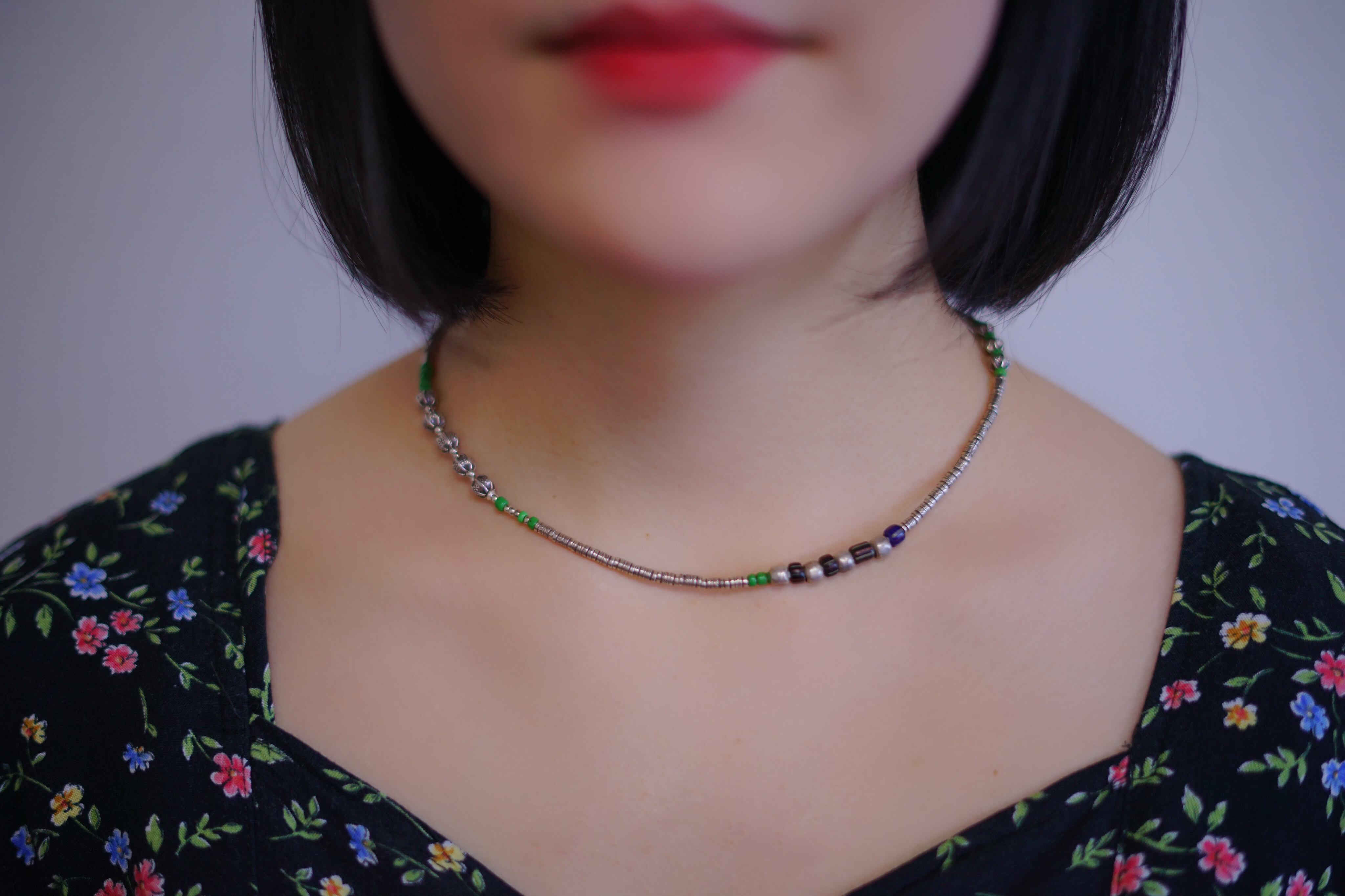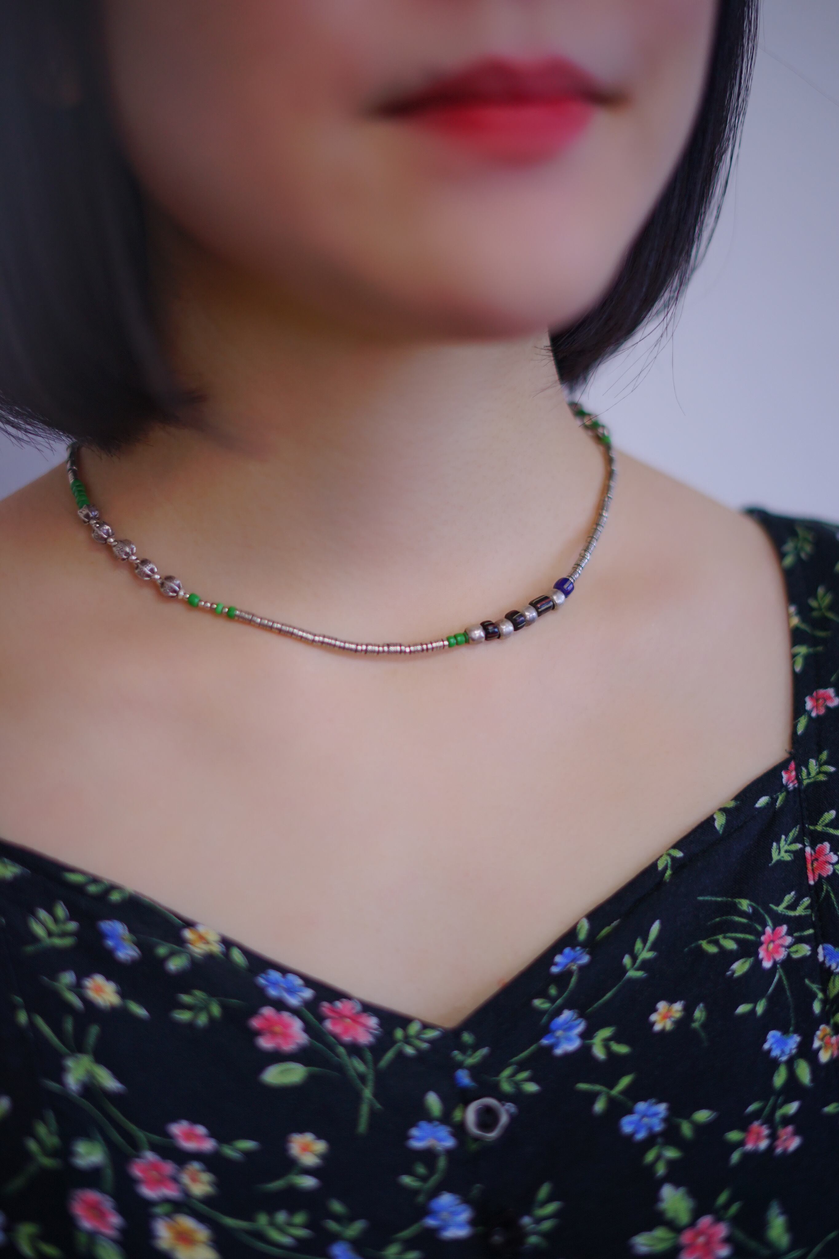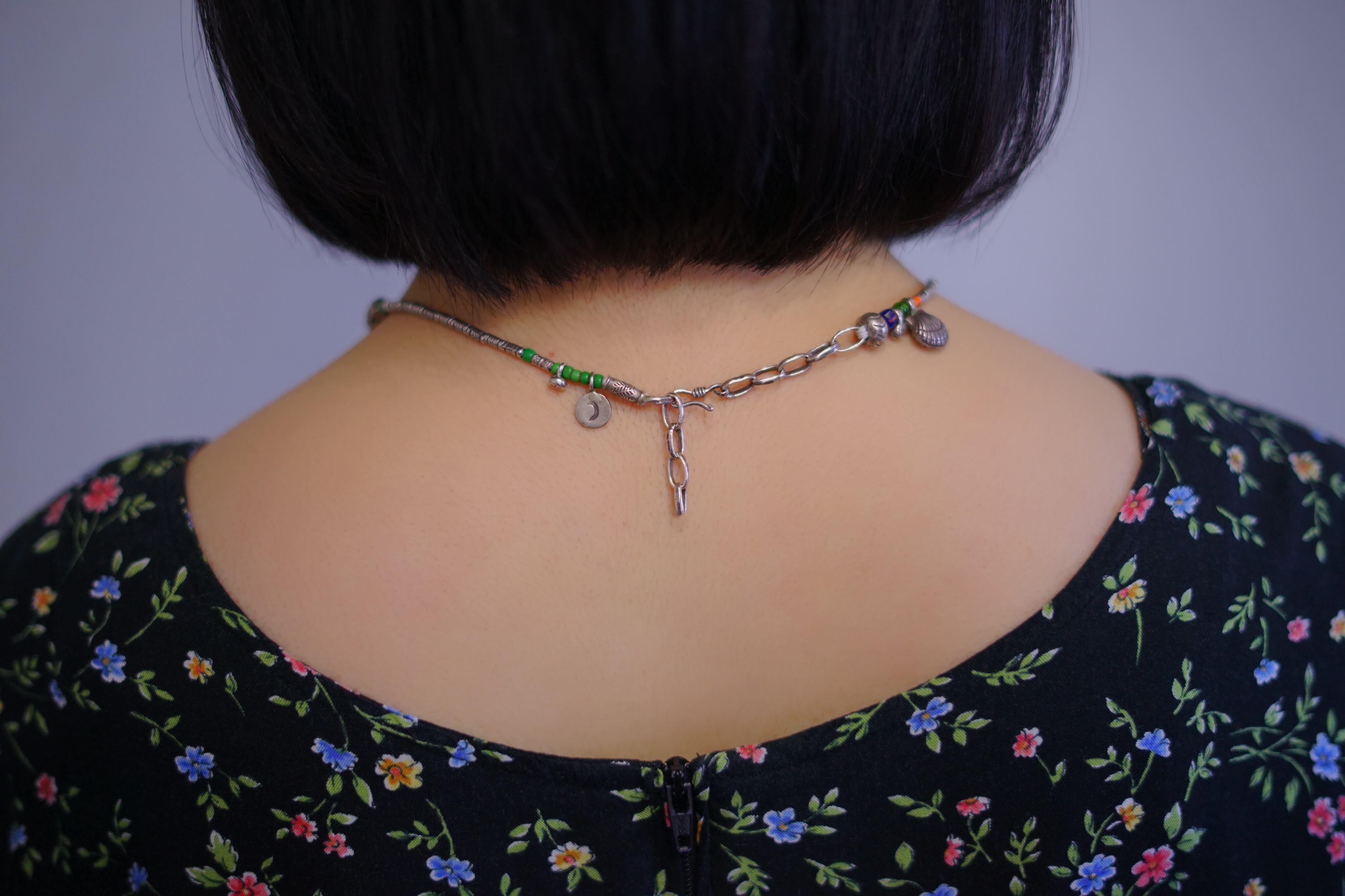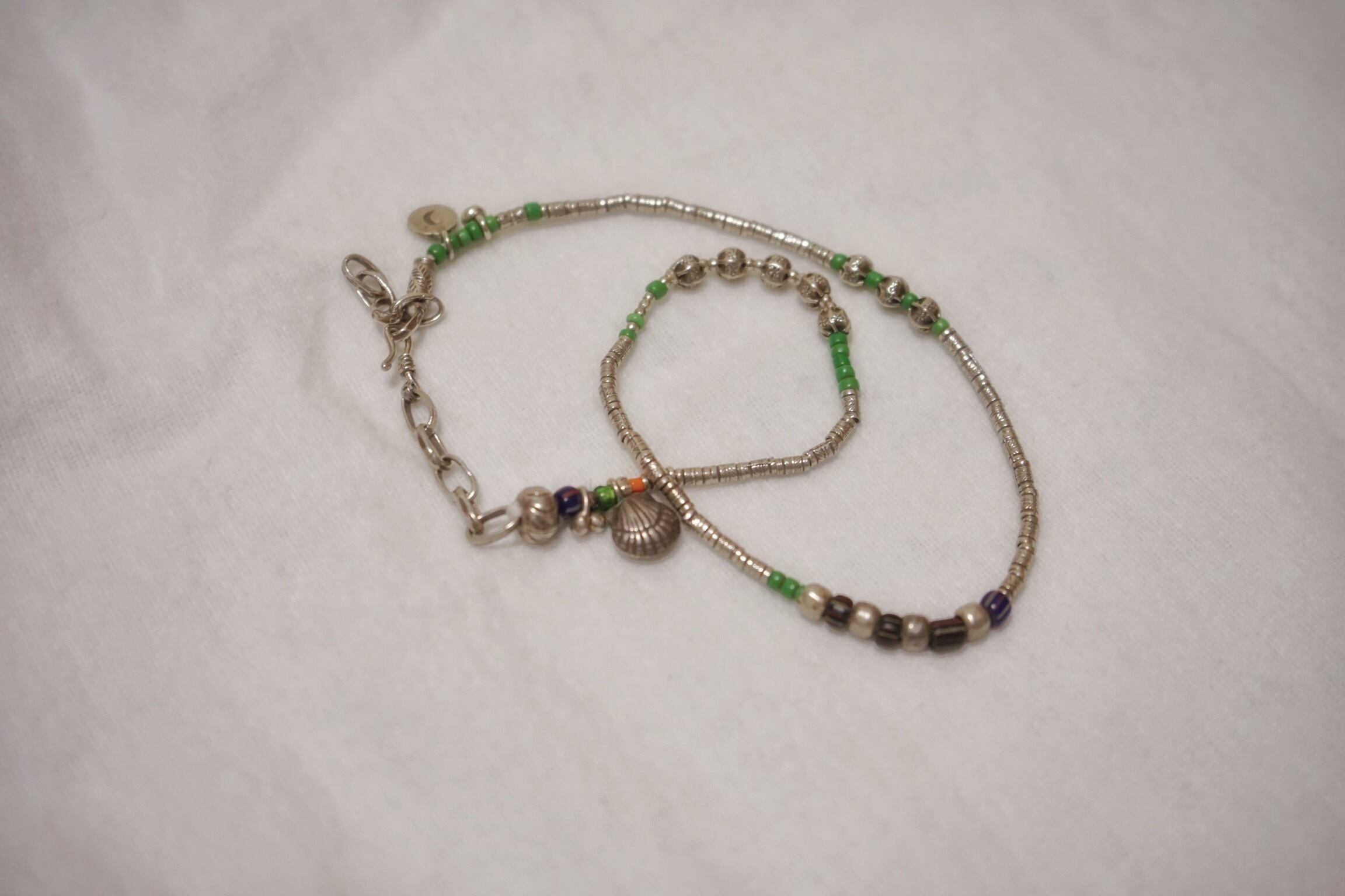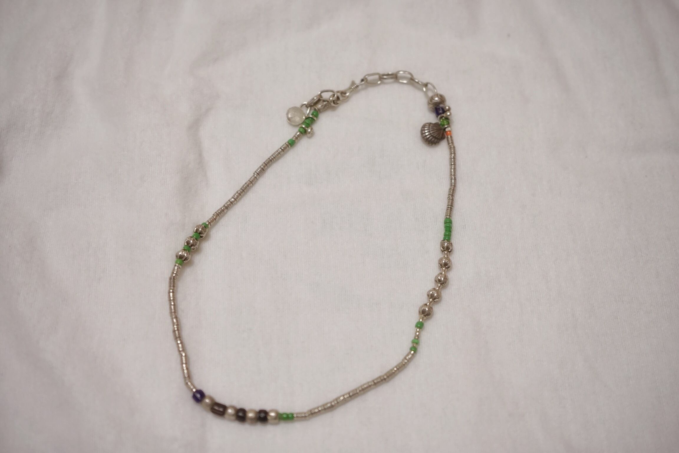 貝殻のチャームにカラフルな石がつけられたネックレス。細かいビーズにはマイクロスタンプが施された繊細なデザインです。アジャスター部分にも貝殻のチャームが施されており後ろから見ても可愛らしいアイテムです。