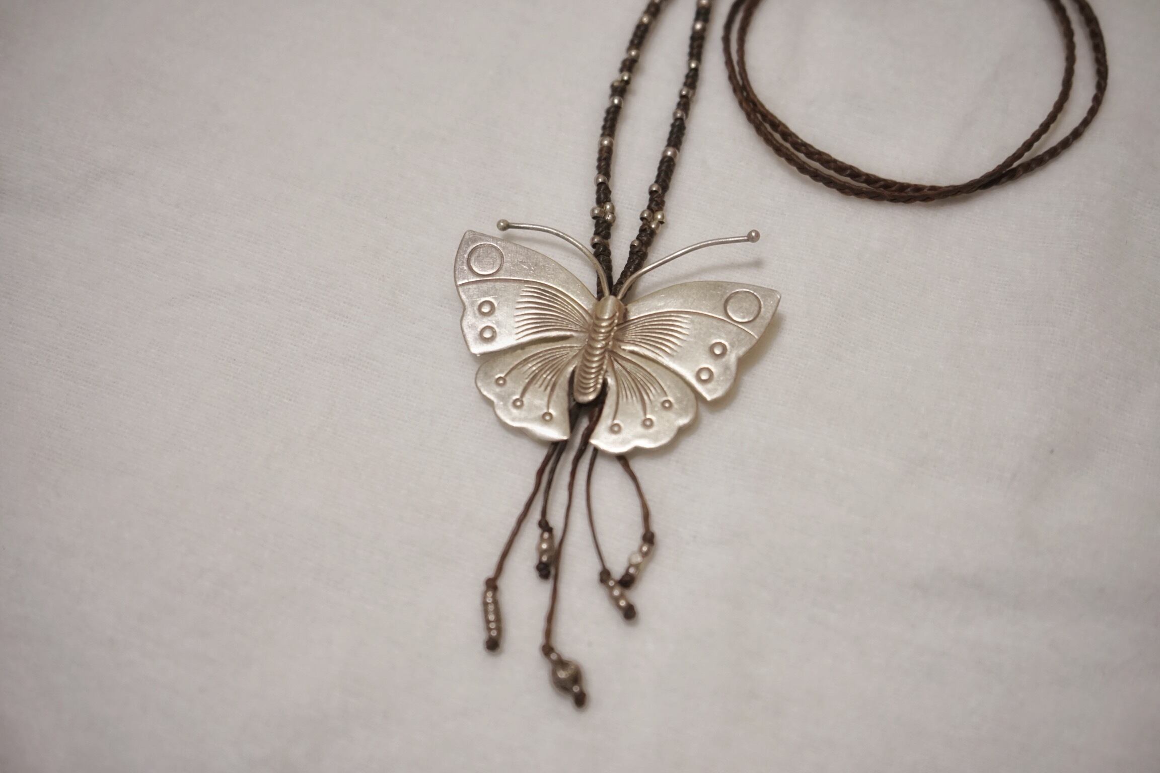 大きめのサイズの蝶が存在感のあるアイテムです。蝶から垂れ下がっている細かいビーズにも模様が描かれた繊細なデザインです。茶紐のネックレスでお好みの長さに調節頂けます。