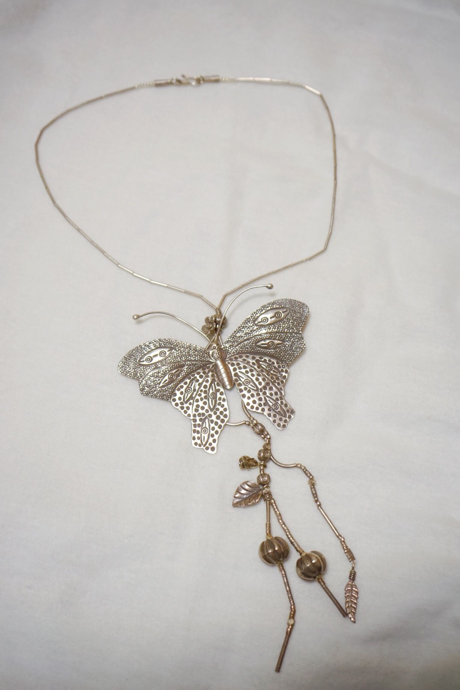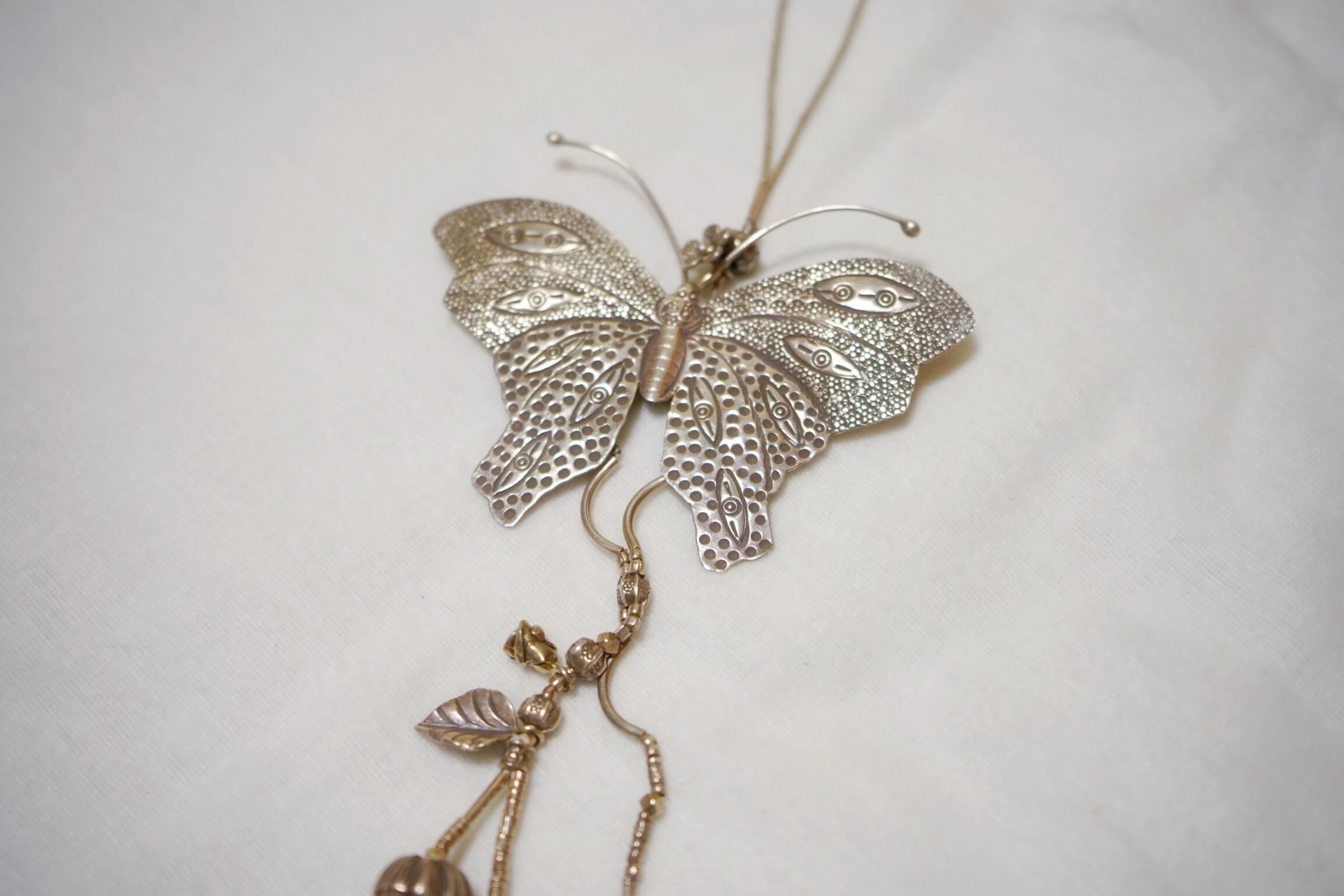 大きな蝶に花や葉など様々なチャームが垂れ下がっている存在感のあるネックレスです。羽にも細かい模様が描かれた繊細なアイテム。カレンシルバーならではの柔らかい質感が魅力です。