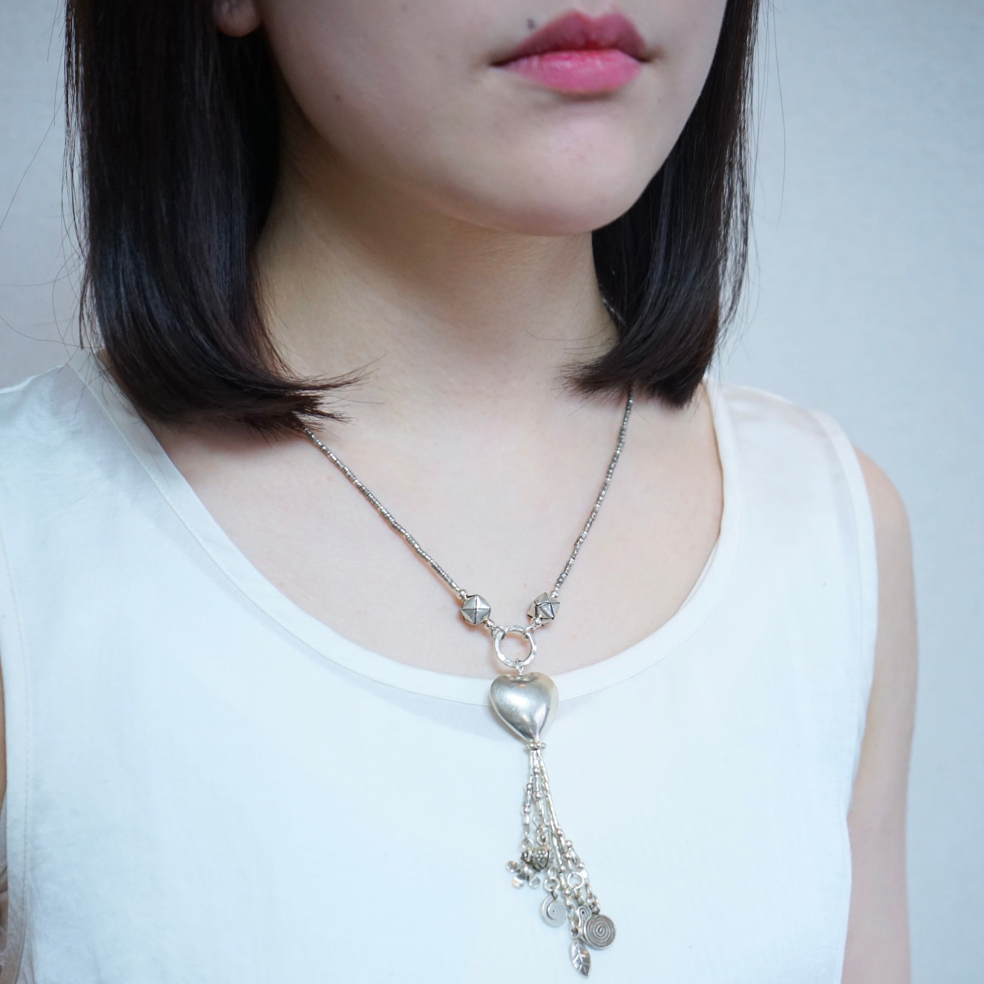 大きなハートに花、葉っぱなど様々なチャームが垂れ下がった存在感のあるネックレスです。ハートは中空になっているため見た目ほど重くありません。