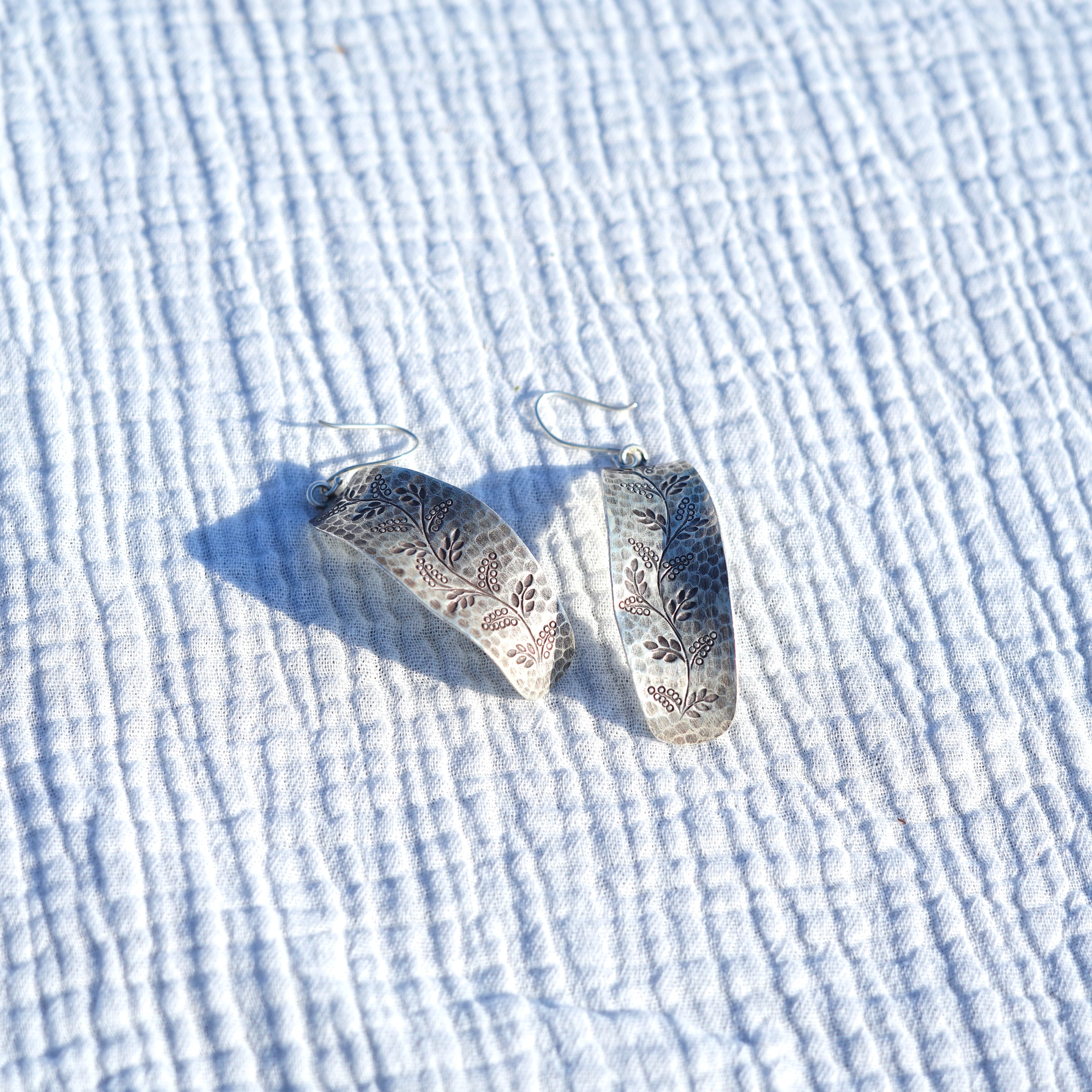 花や葉のスタンプが施された存在感のあるピアスです。大きめなシルエットのピアスのため歩く度にゆらゆらと揺れ、絶妙なカーブが可愛らしいアイテムです。