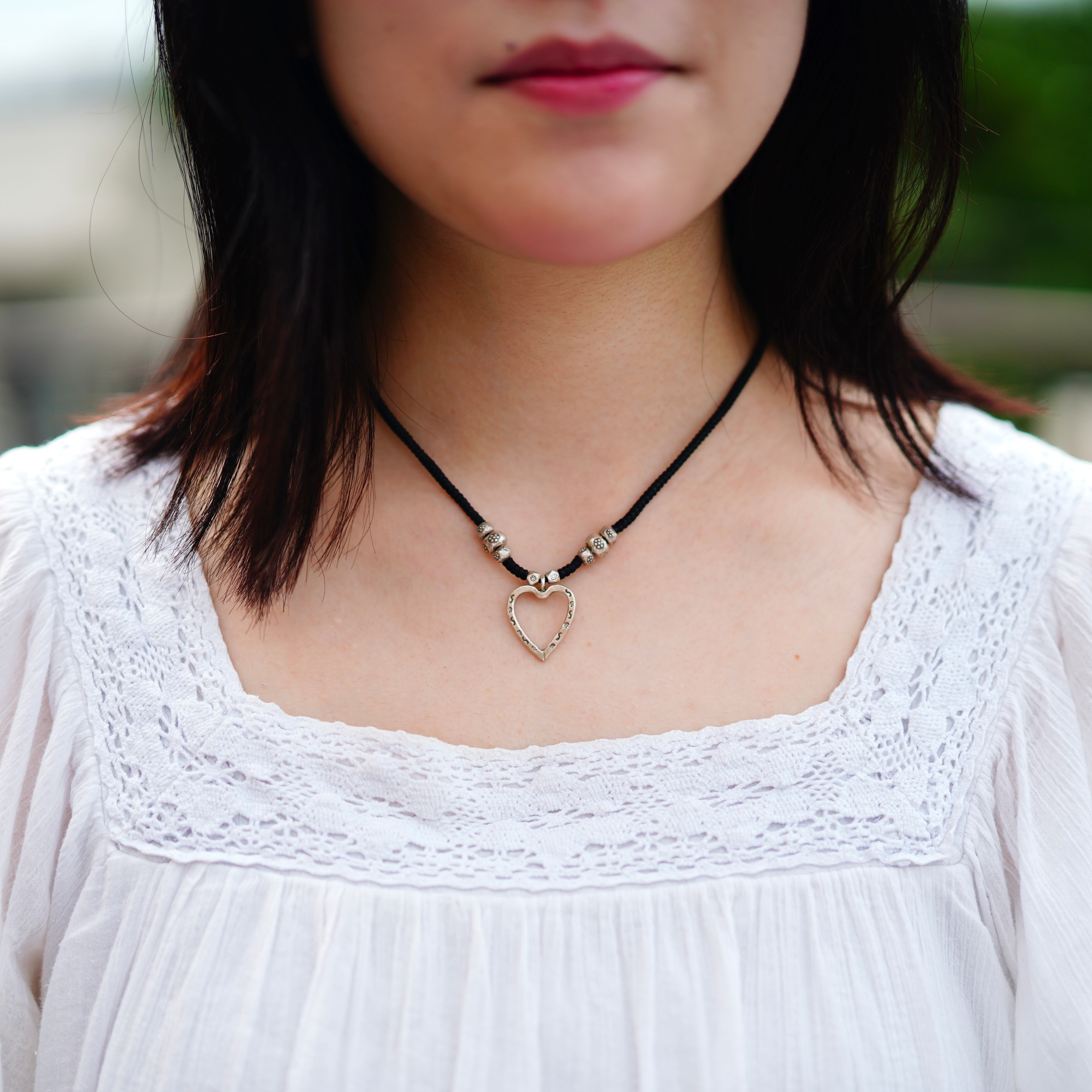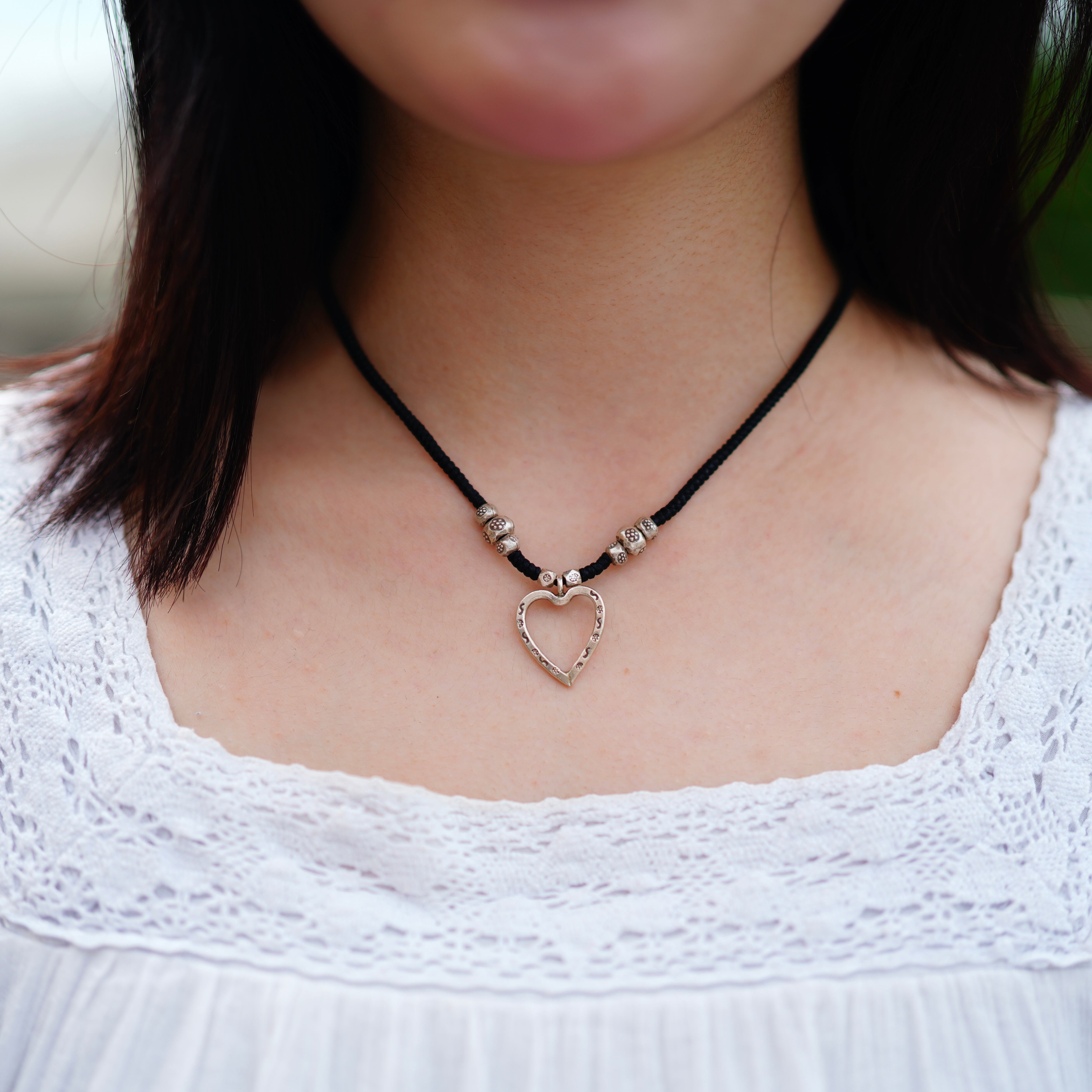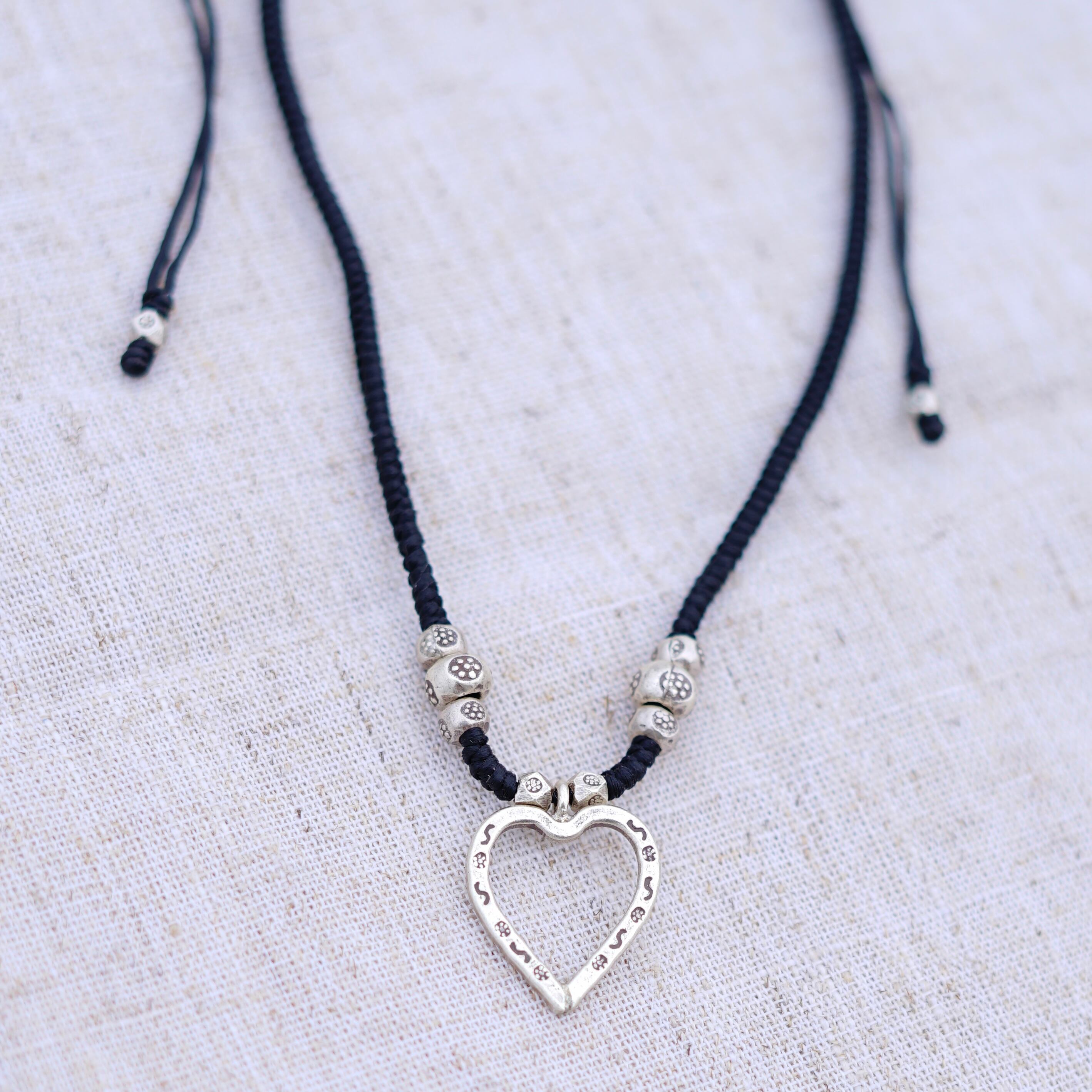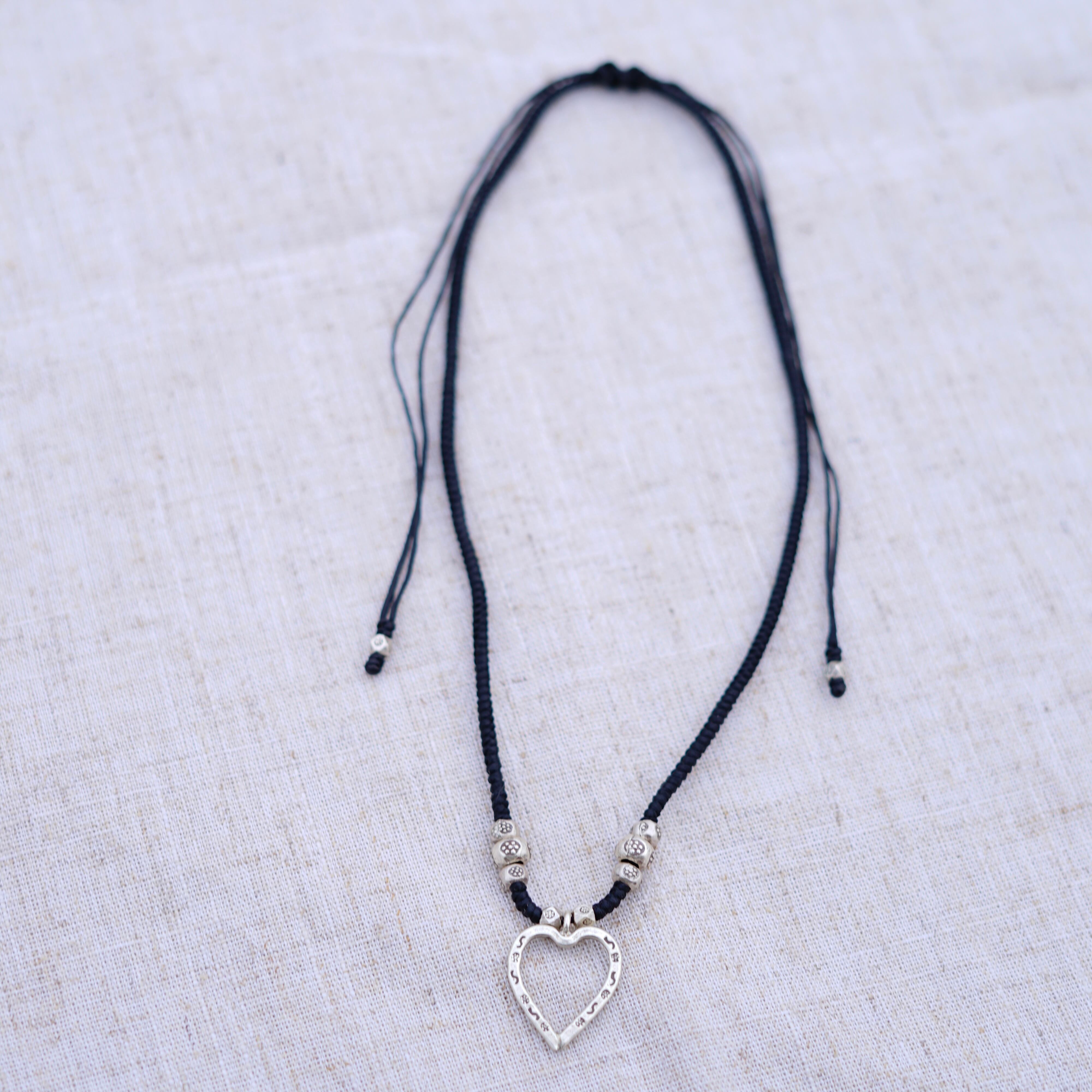 黒紐のオープンハートのチャームがついたネックレスです。頭から被るタイプで紐で調整して付けて頂けます。小さなビーズには花のスタンプが施され、ハートには細かい模様のスタンプがされ、細部まで拘りの詰まった可愛らしいアイテムです。
