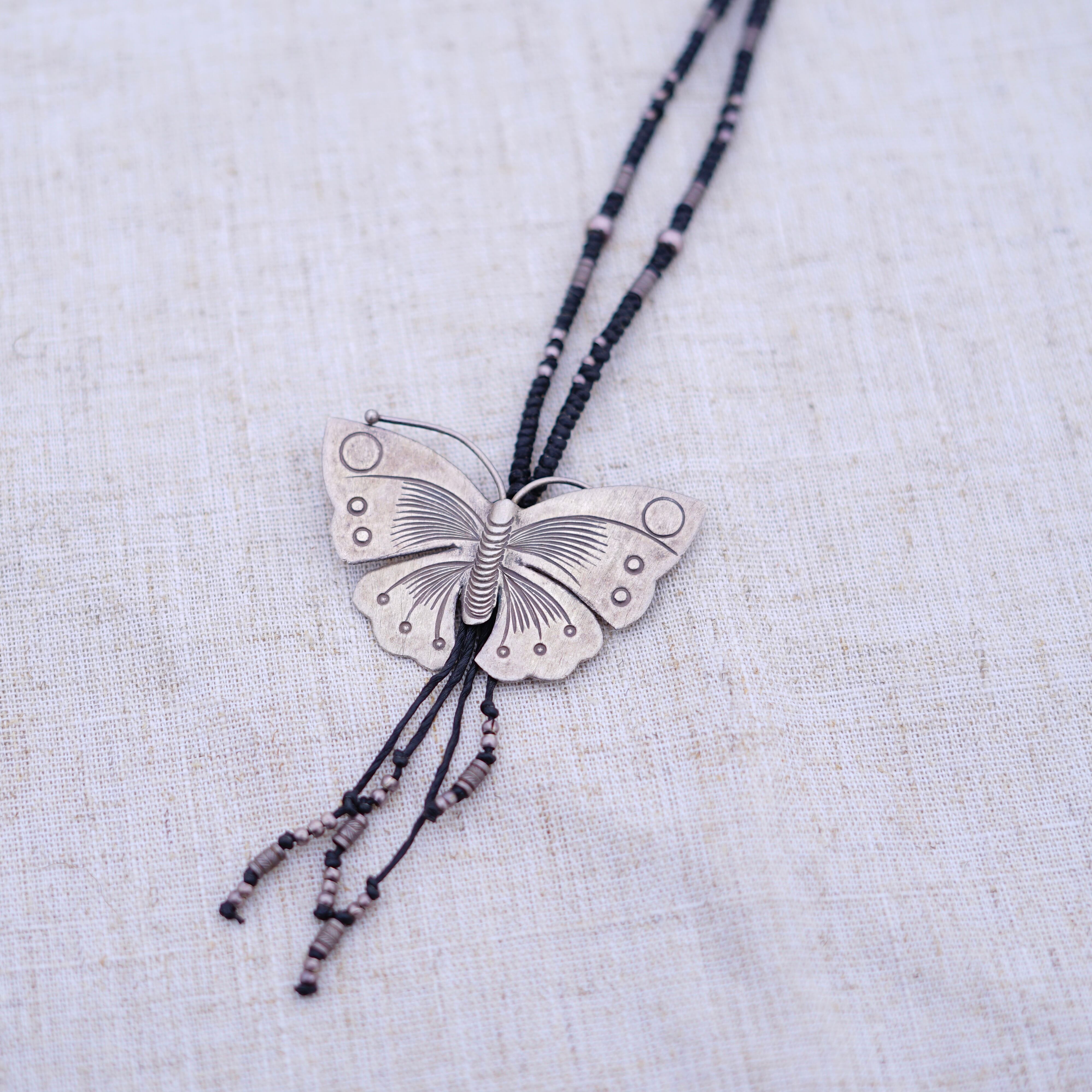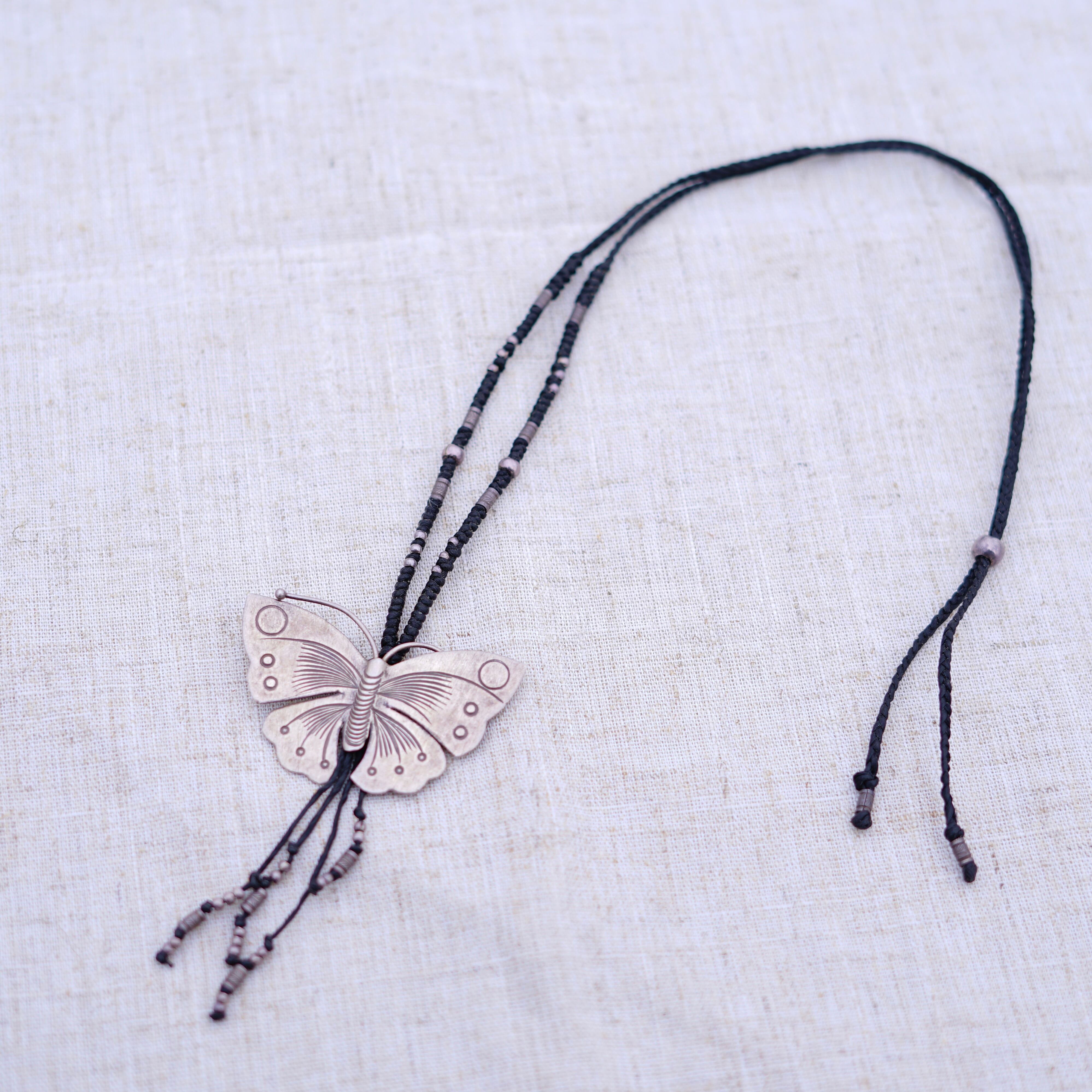 繊細なデザインが施された蝶のチャームに黒色のワックスコードの組み合わせが絶妙なネックレスです。こちらのアイテムはご自身のお好きな長さで調整してつけて頂けます。