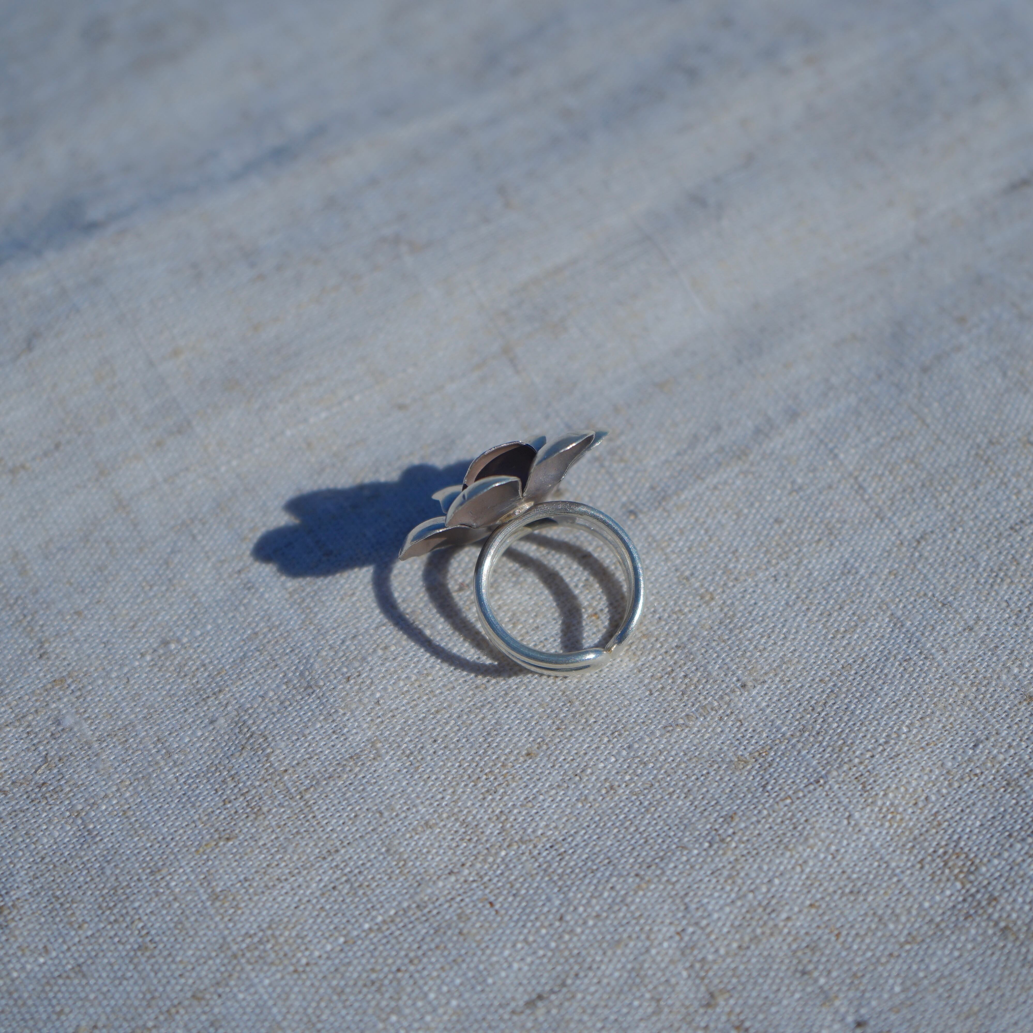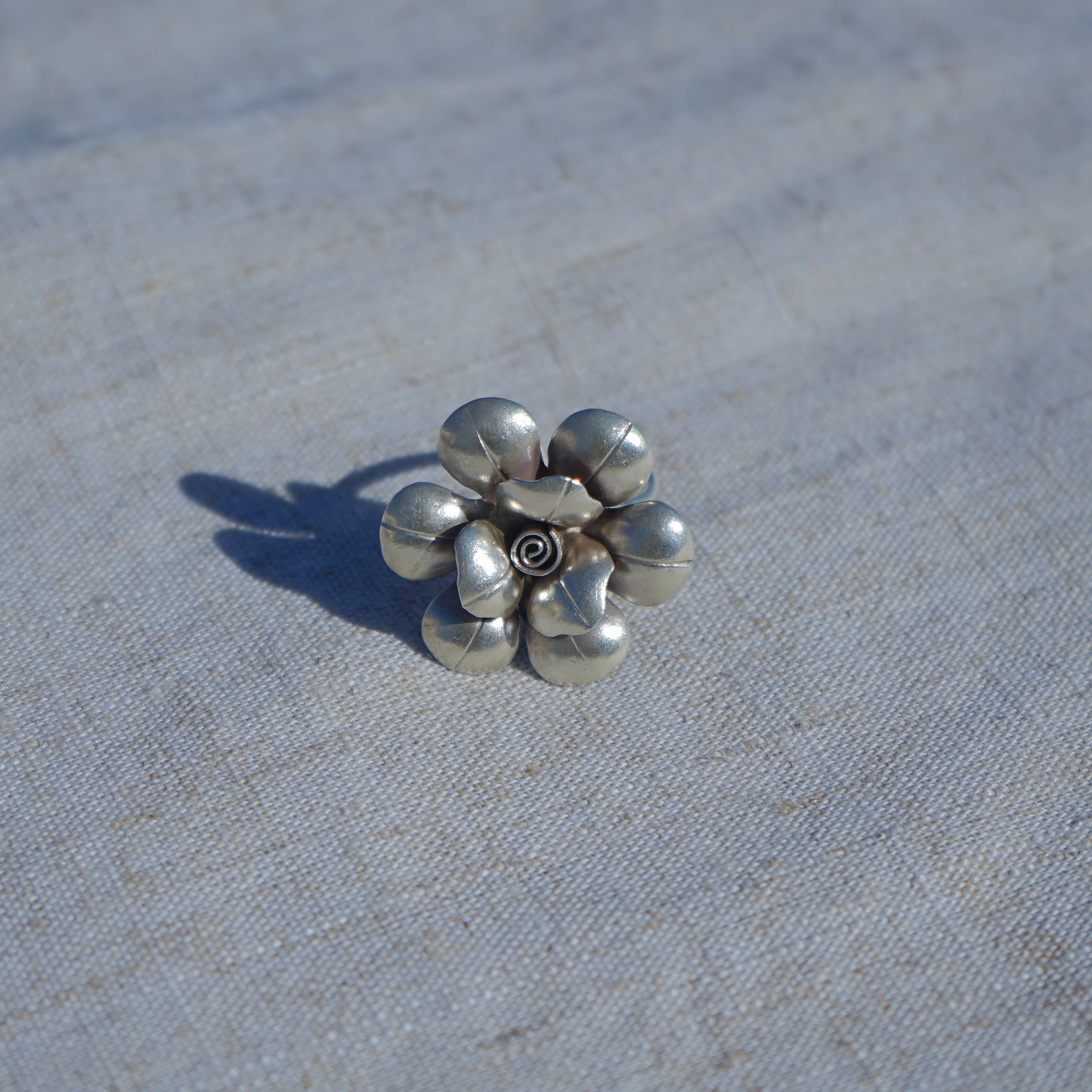 インパクトのある大きな花が魅力のリングです。ぱっと目を惹くボリューム感ですが、軽い付け心地です。多少のサイズ調整は可能ですが、純度の高いシルバーを使用しておりやわらかい為、調整の際はお気を付け下さい。