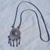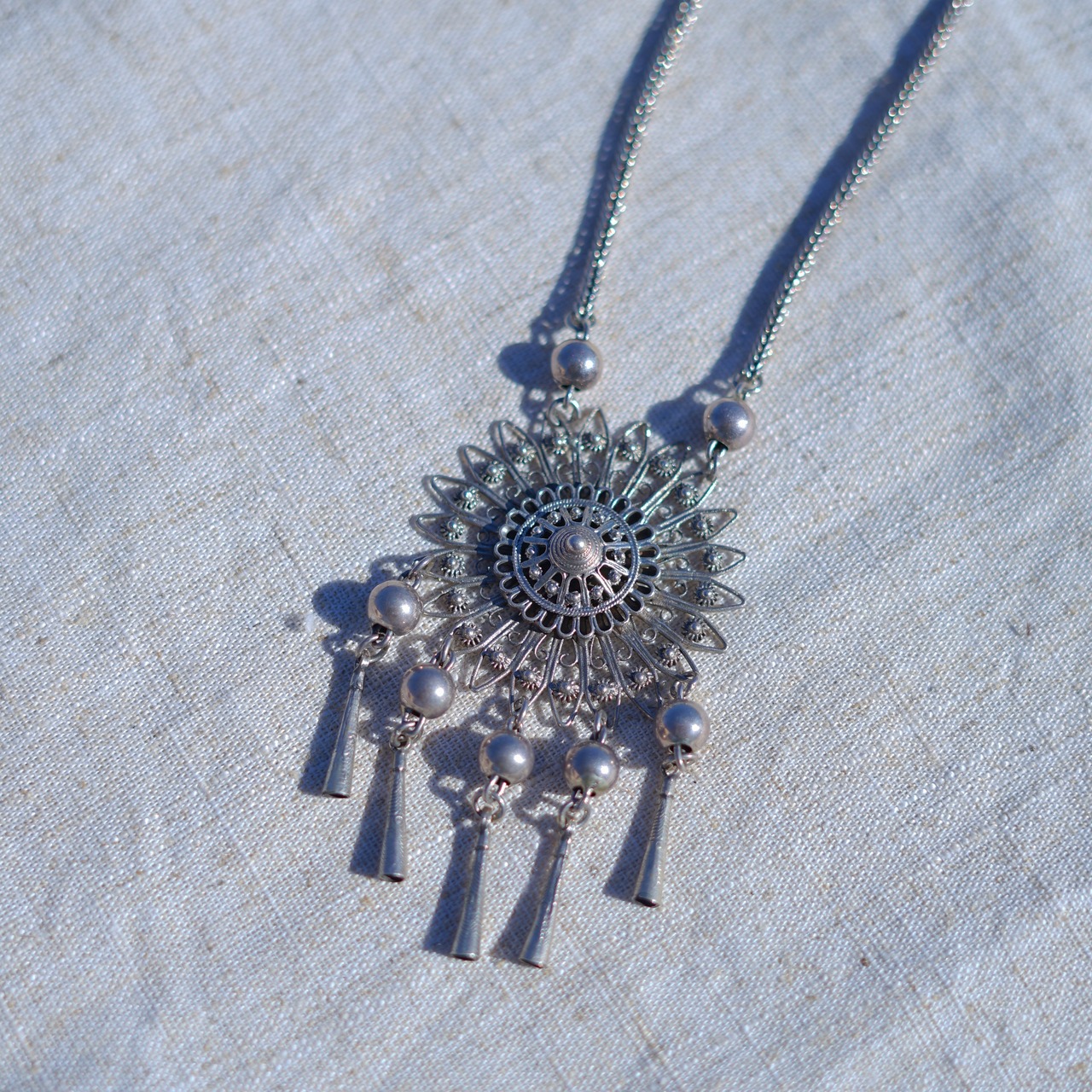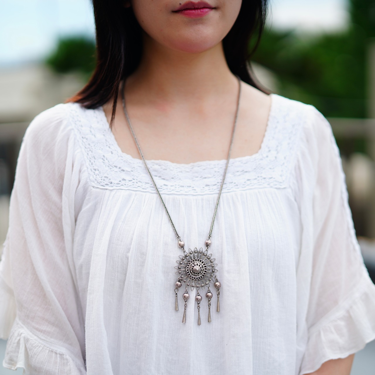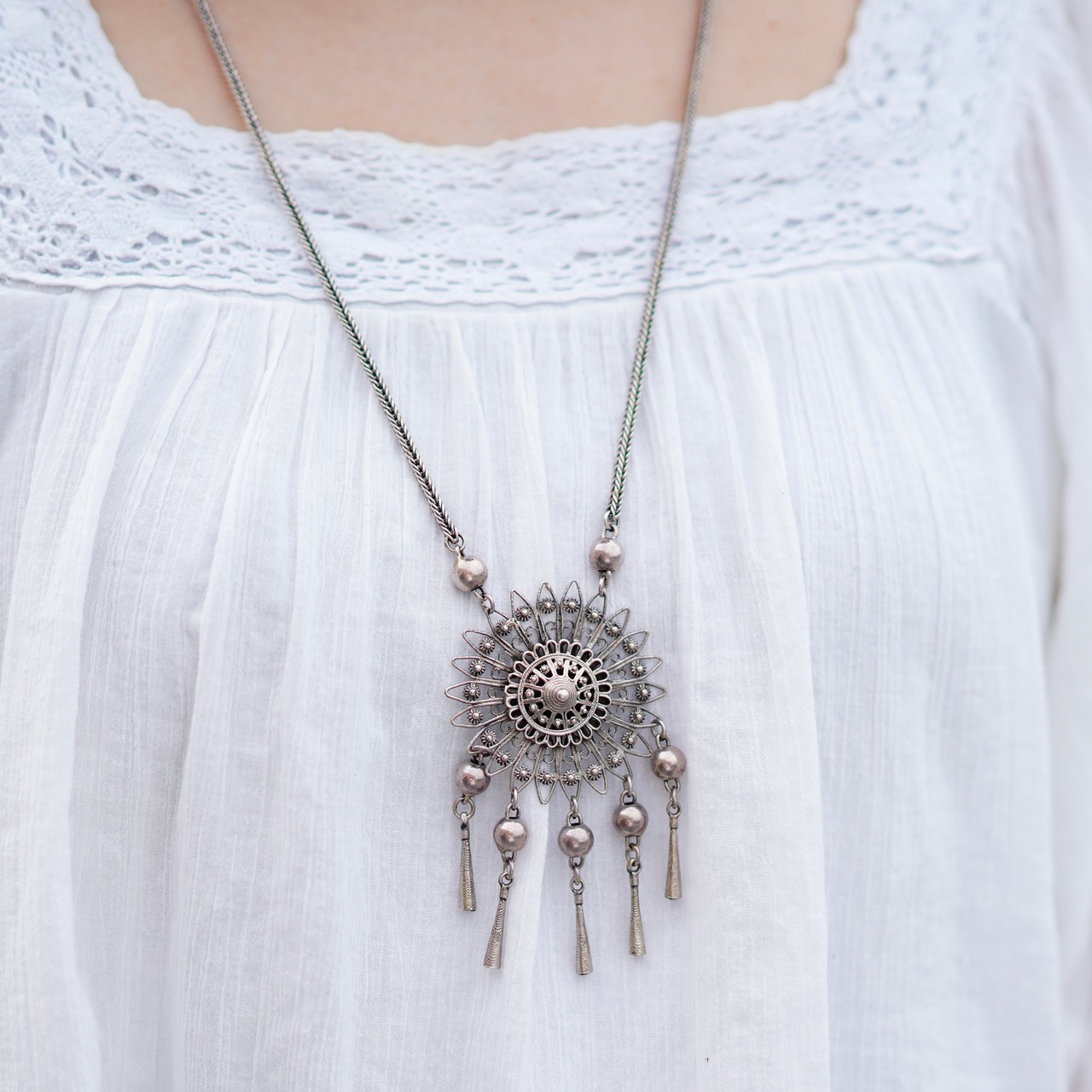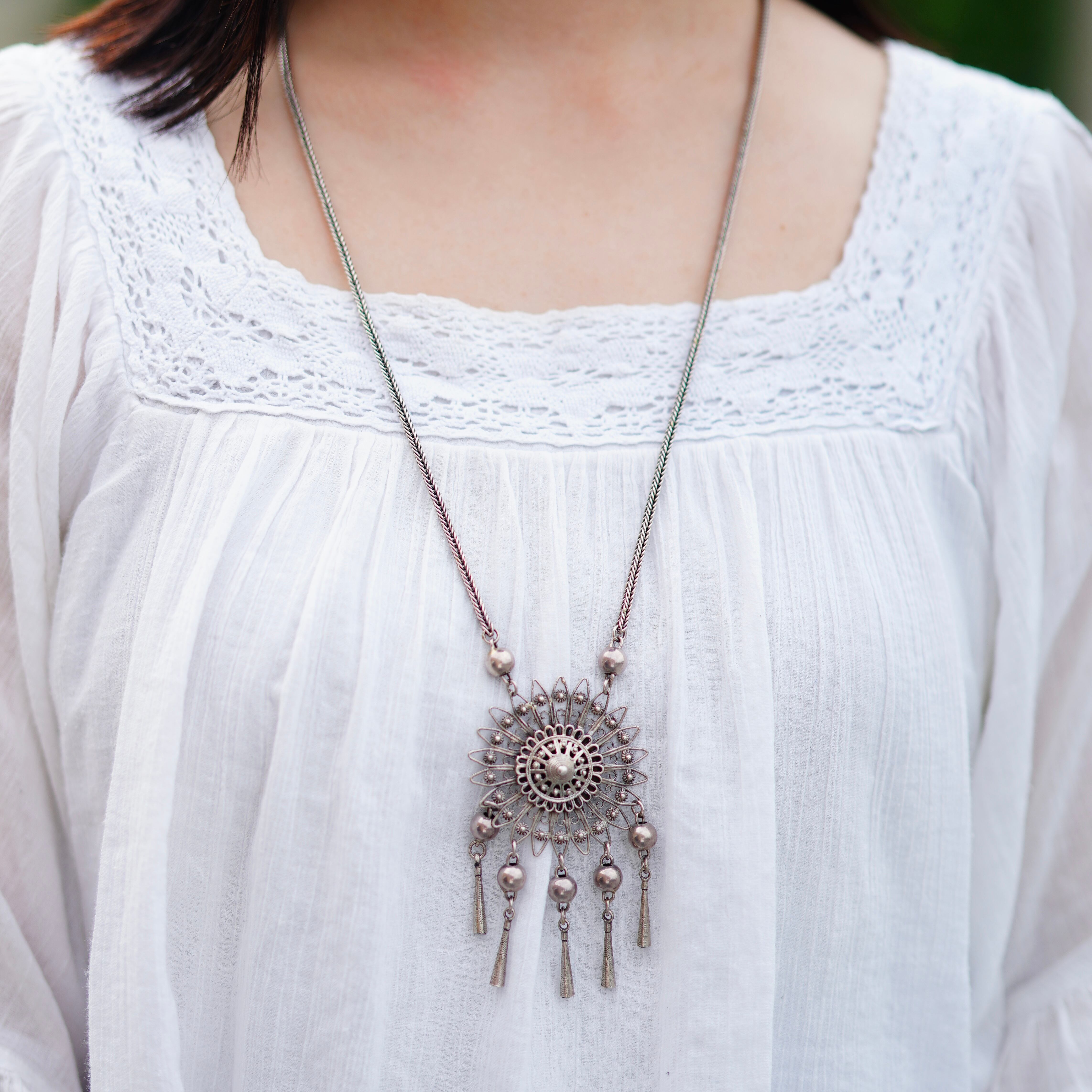 ボヘミアンな雰囲気の存在感のあるネックレスです。こちらの商品は、限られた職人さんのみがひとつひとつ手作業にて作成している繊細なデザインが特徴的なアイテムです。小さなお花のチャームが沢山使われており、垂れ下がったビーズが歩く度にゆらゆらと揺れて可愛らしいアイテムです。