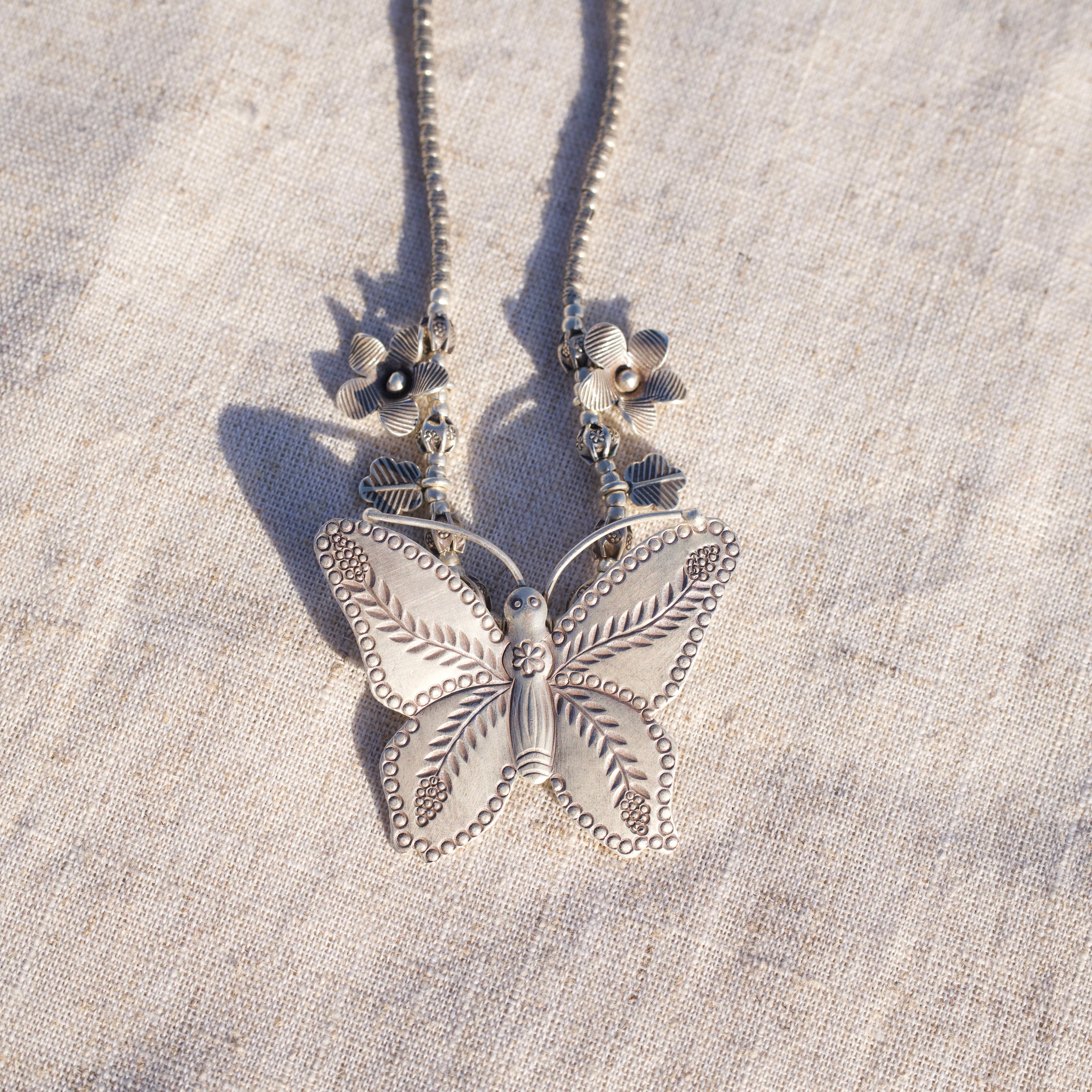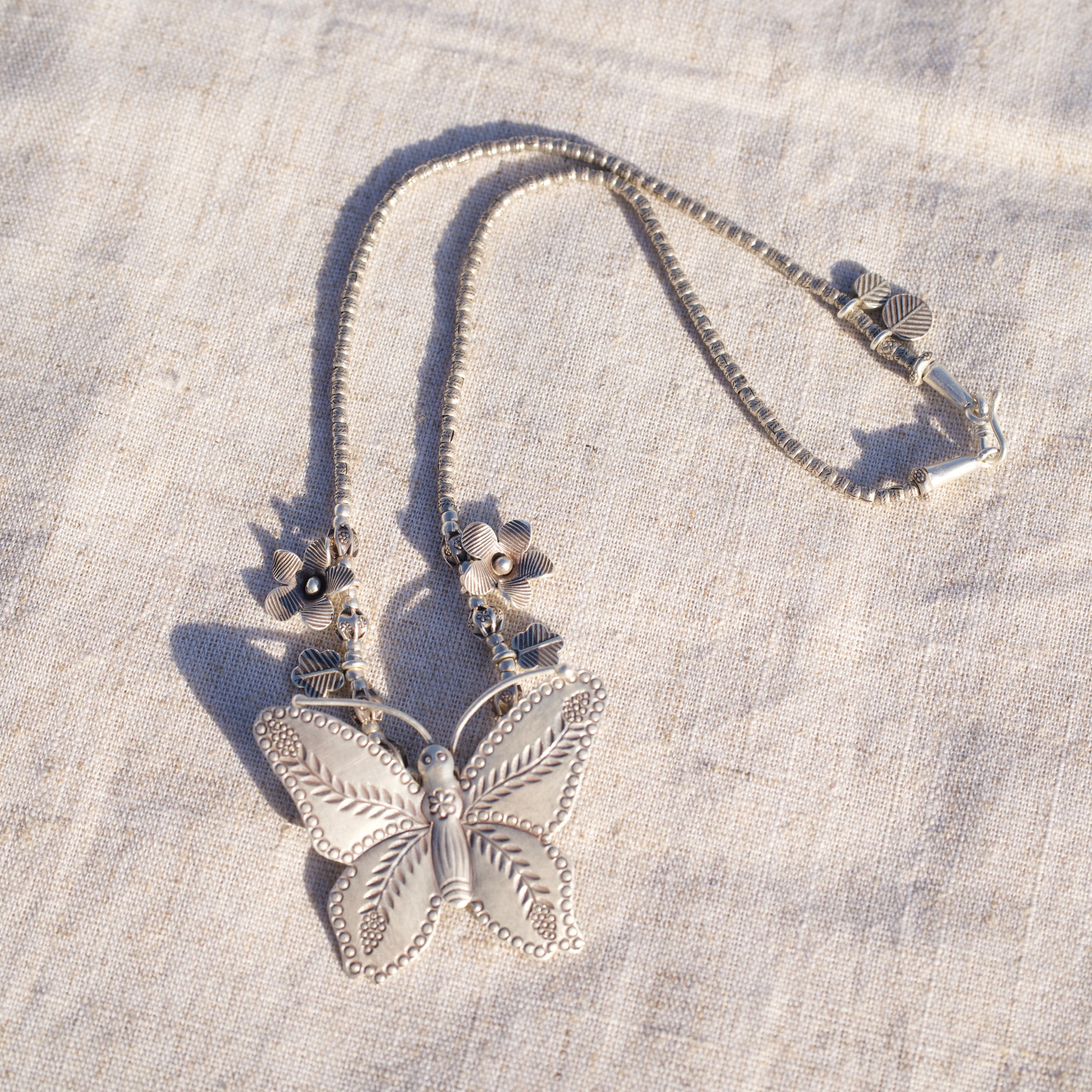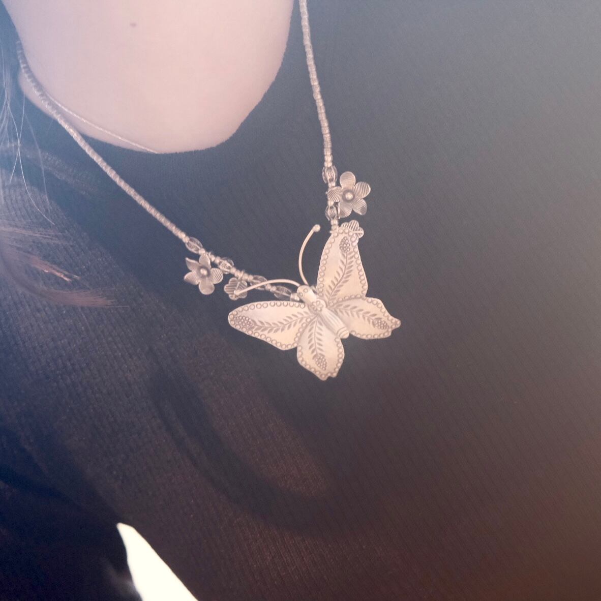 可愛らしいデザインが描かれた大きめな蝶に花や葉など様々なチャームがついている存在感のあるネックレスです。羽や小さなビーズひとつひとつに細かな模様が描かれた繊細なアイテム。カレンシルバーならではの柔らかい質感が魅力です。