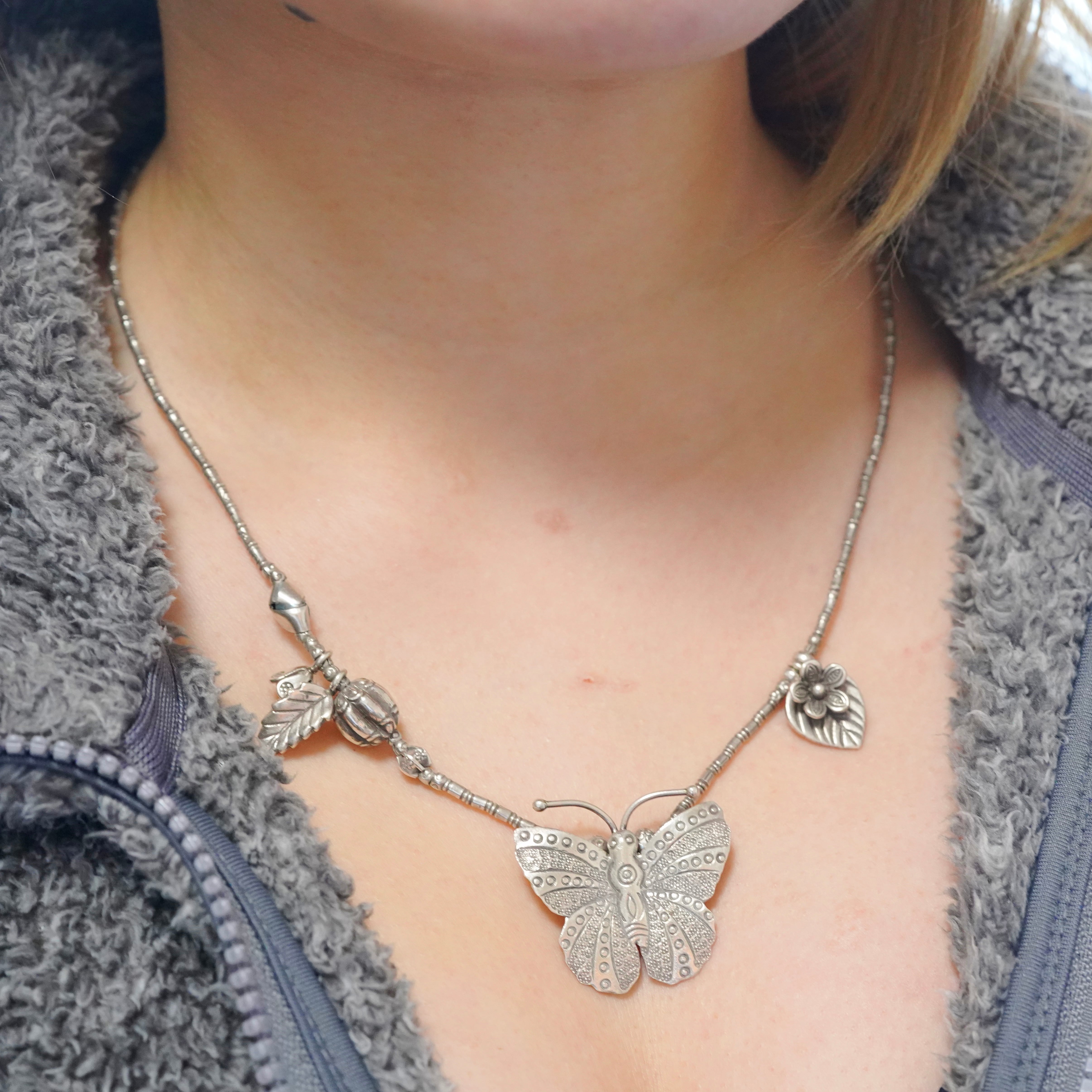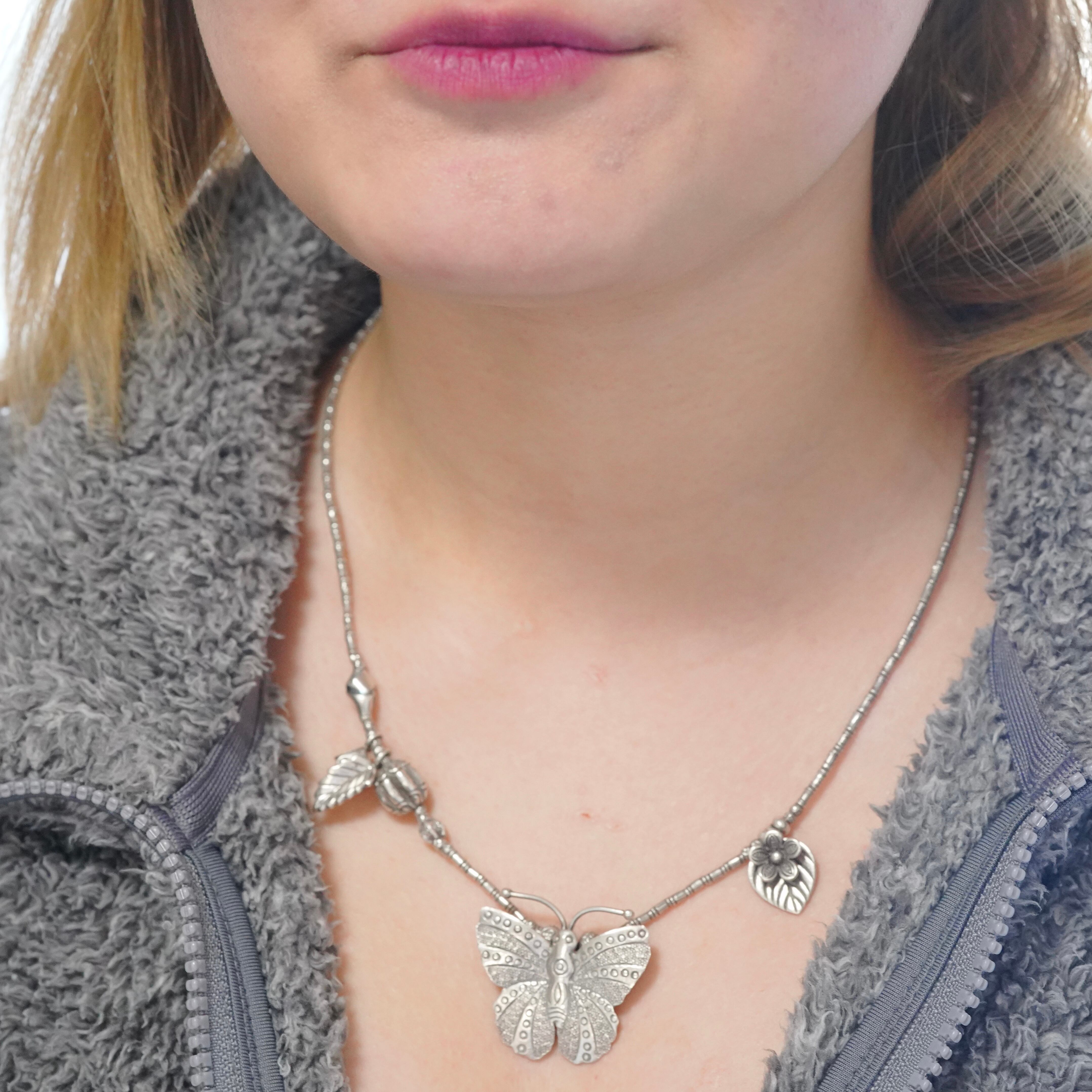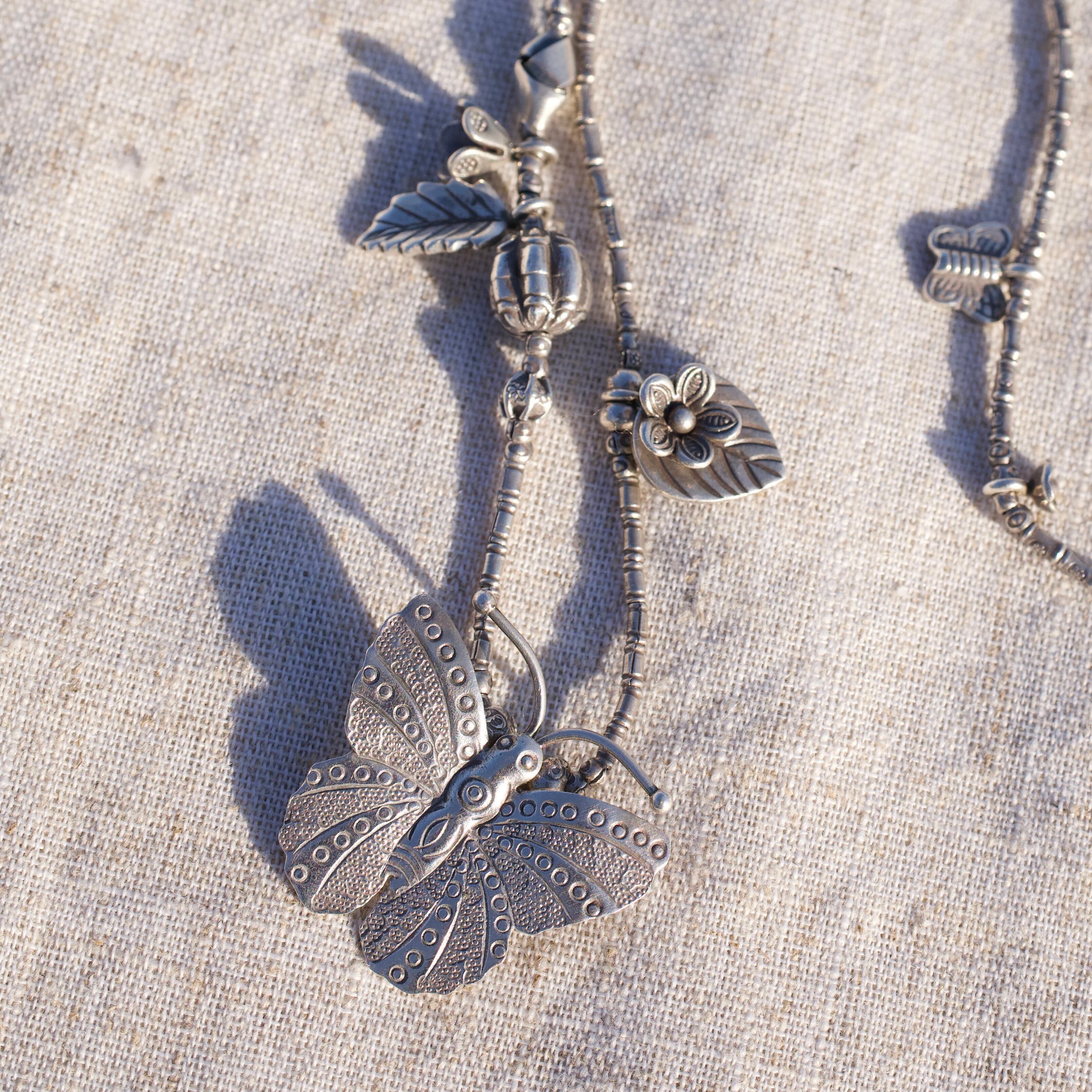 蝶に花や葉など様々なチャームがついている存在感のあるネックレスです。羽や小さなビーズひとつひとつに細かな模様が描かれた繊細なアイテム。カレンシルバーならではの柔らかい質感が魅力です。