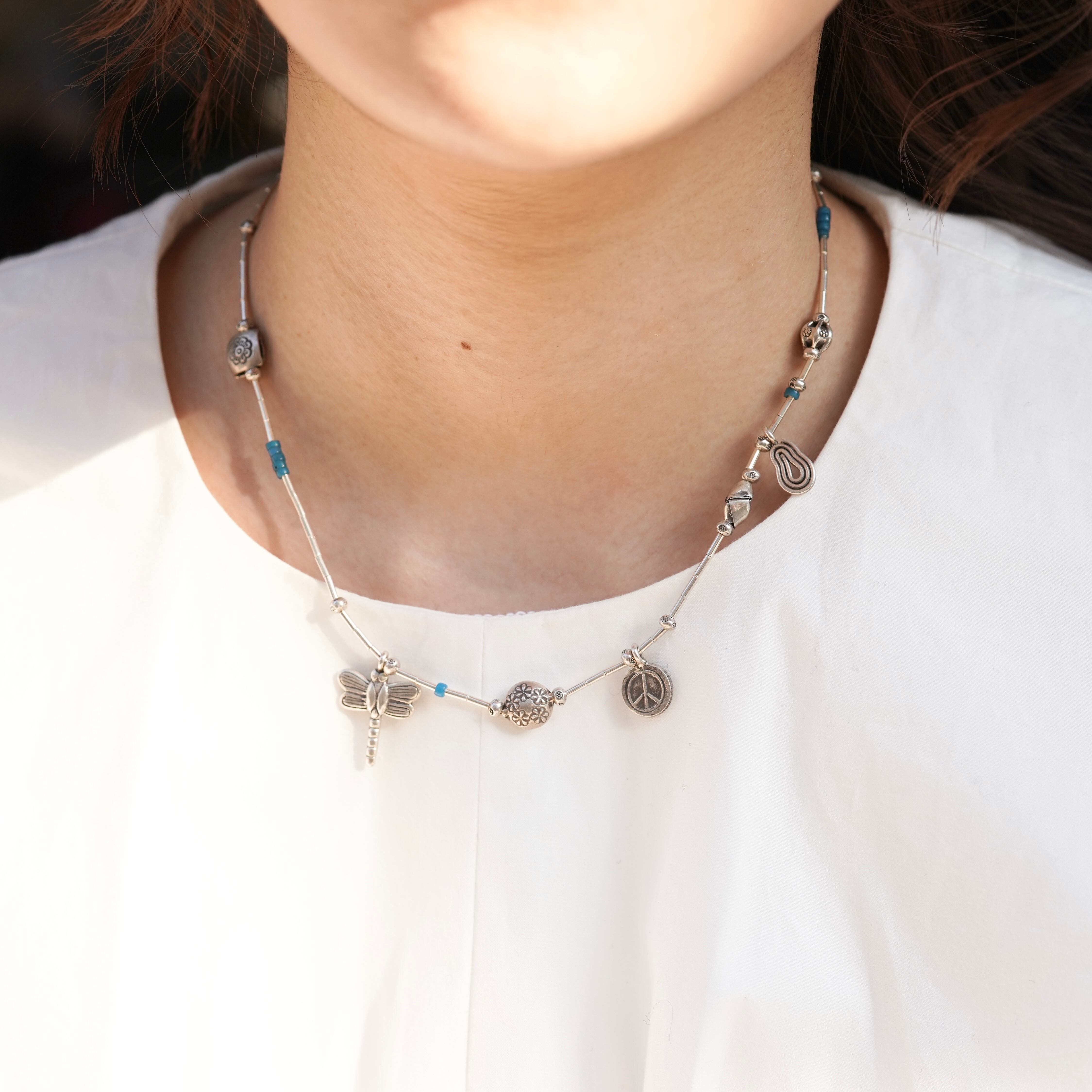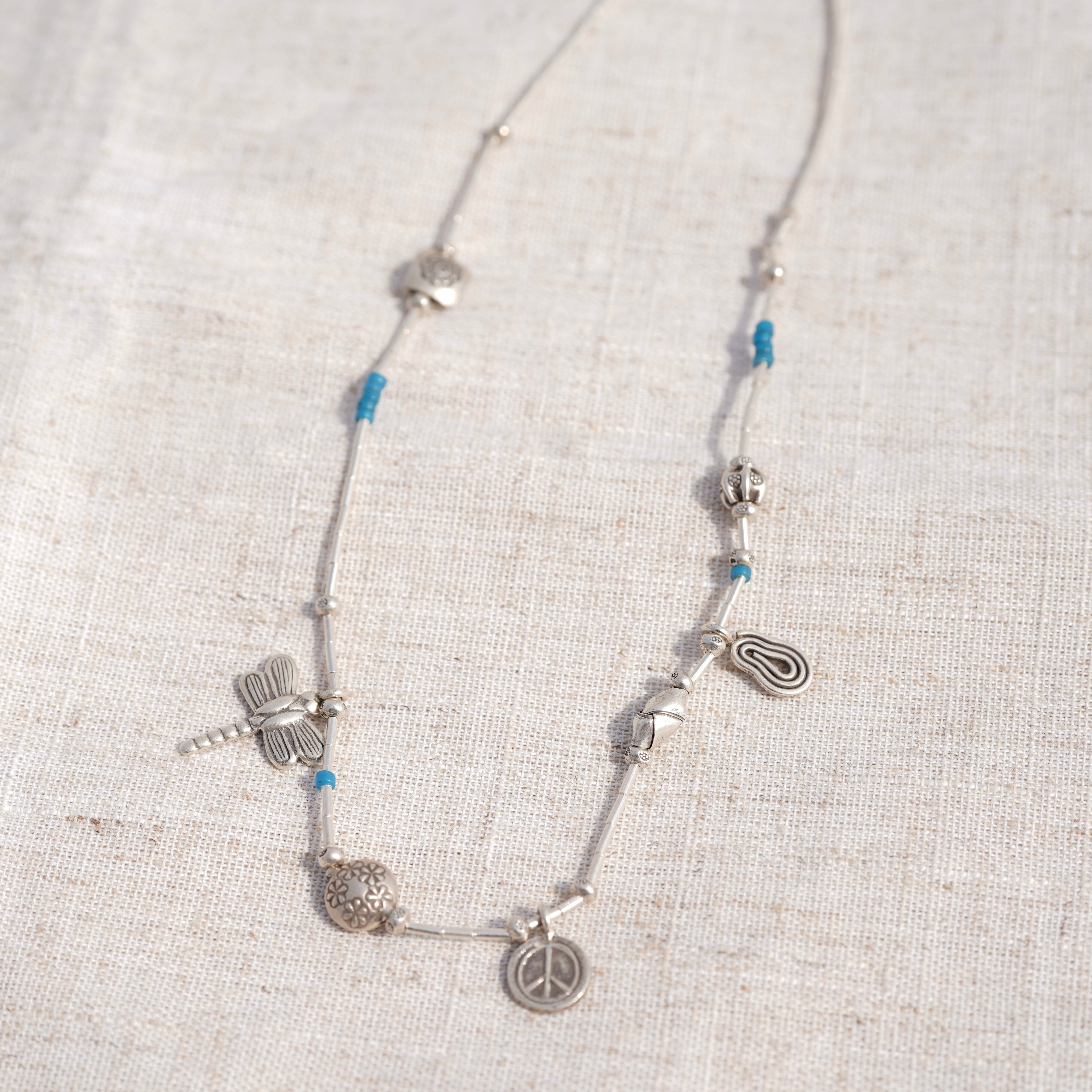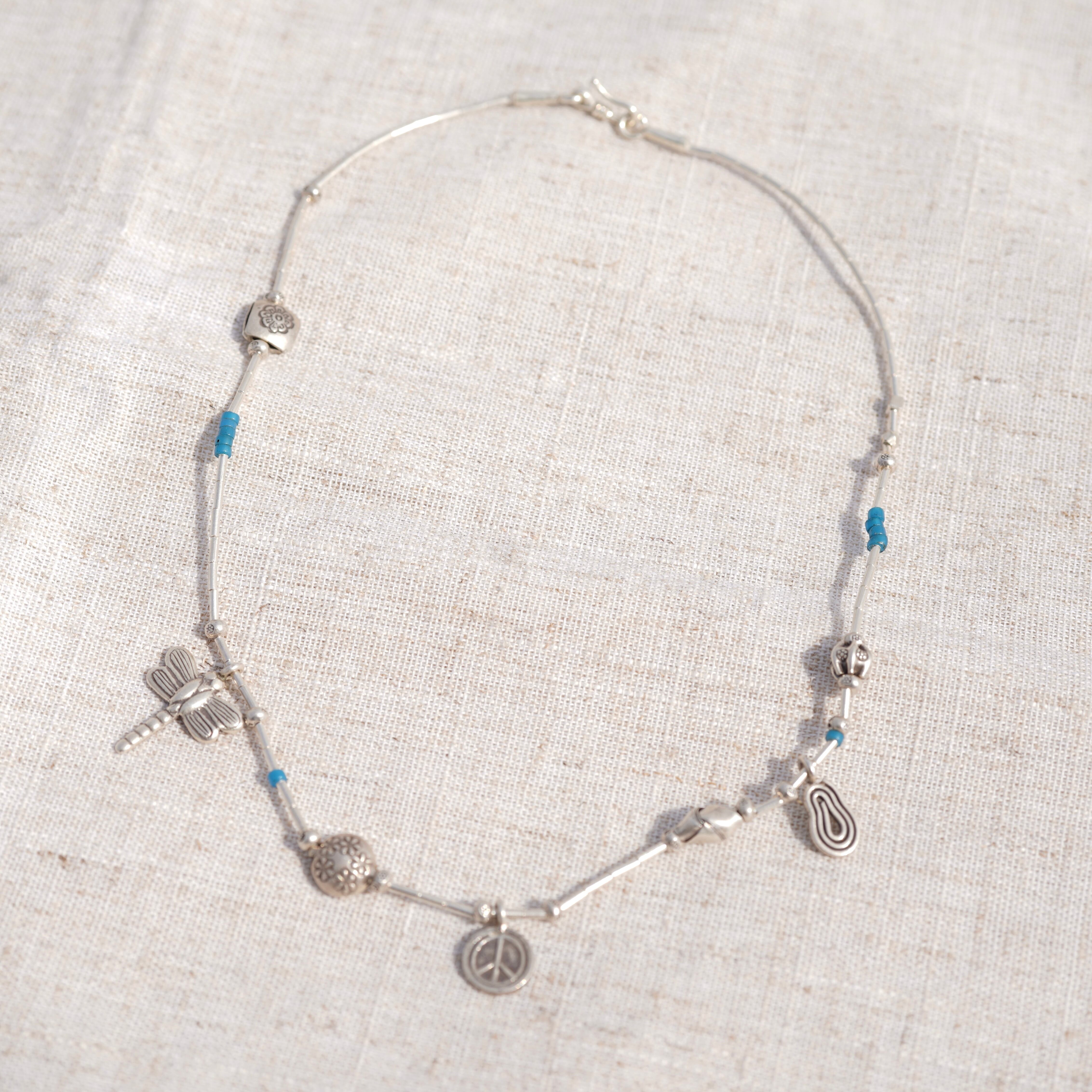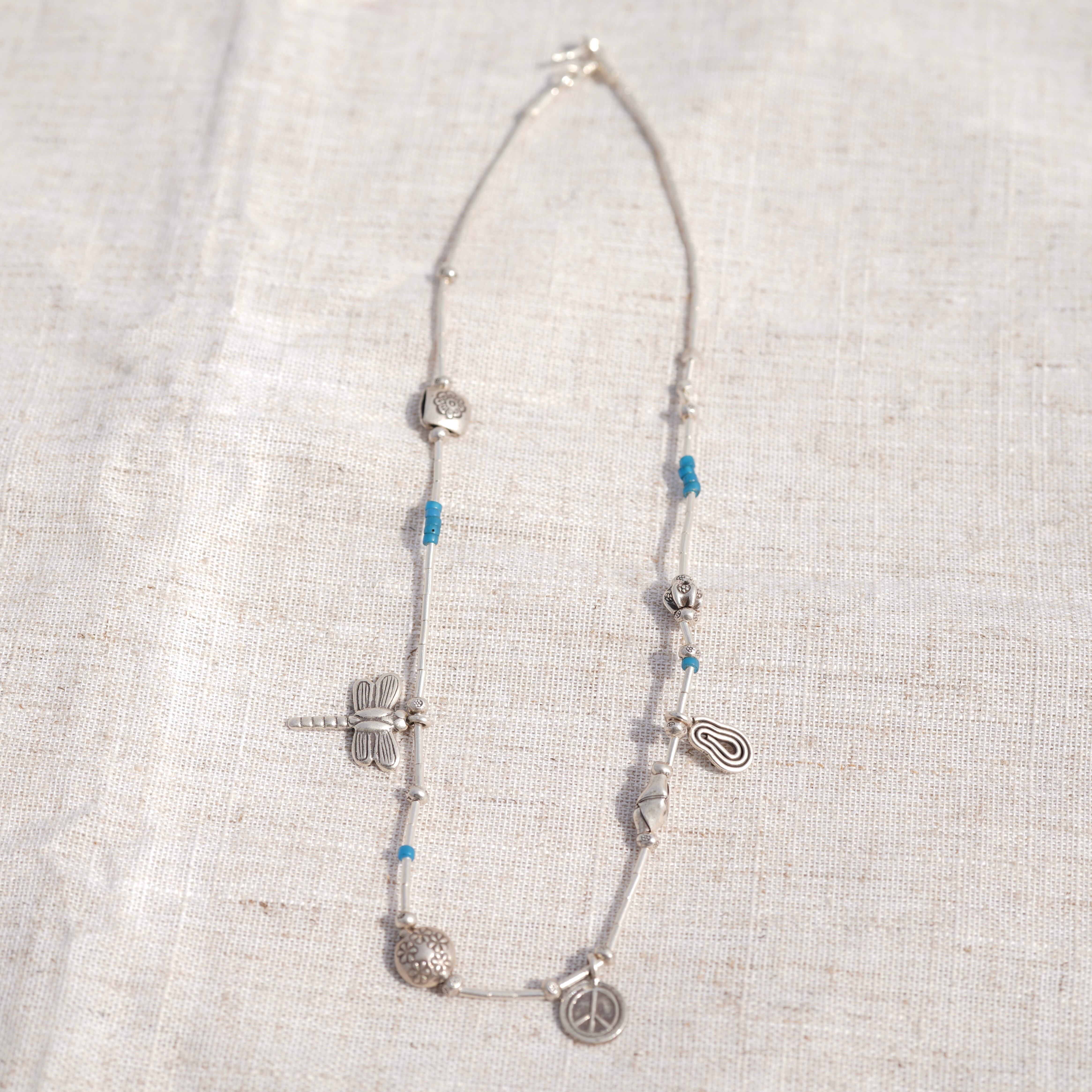ピースマークやトンボ、花のスタンプが施されたチャームに青色のビーズが沢山ついた夏らしいネックレスです。カレンシルバーならではの柔らかい質感が魅力的で、スタイルを選ばず付けて頂けるアイテムです。