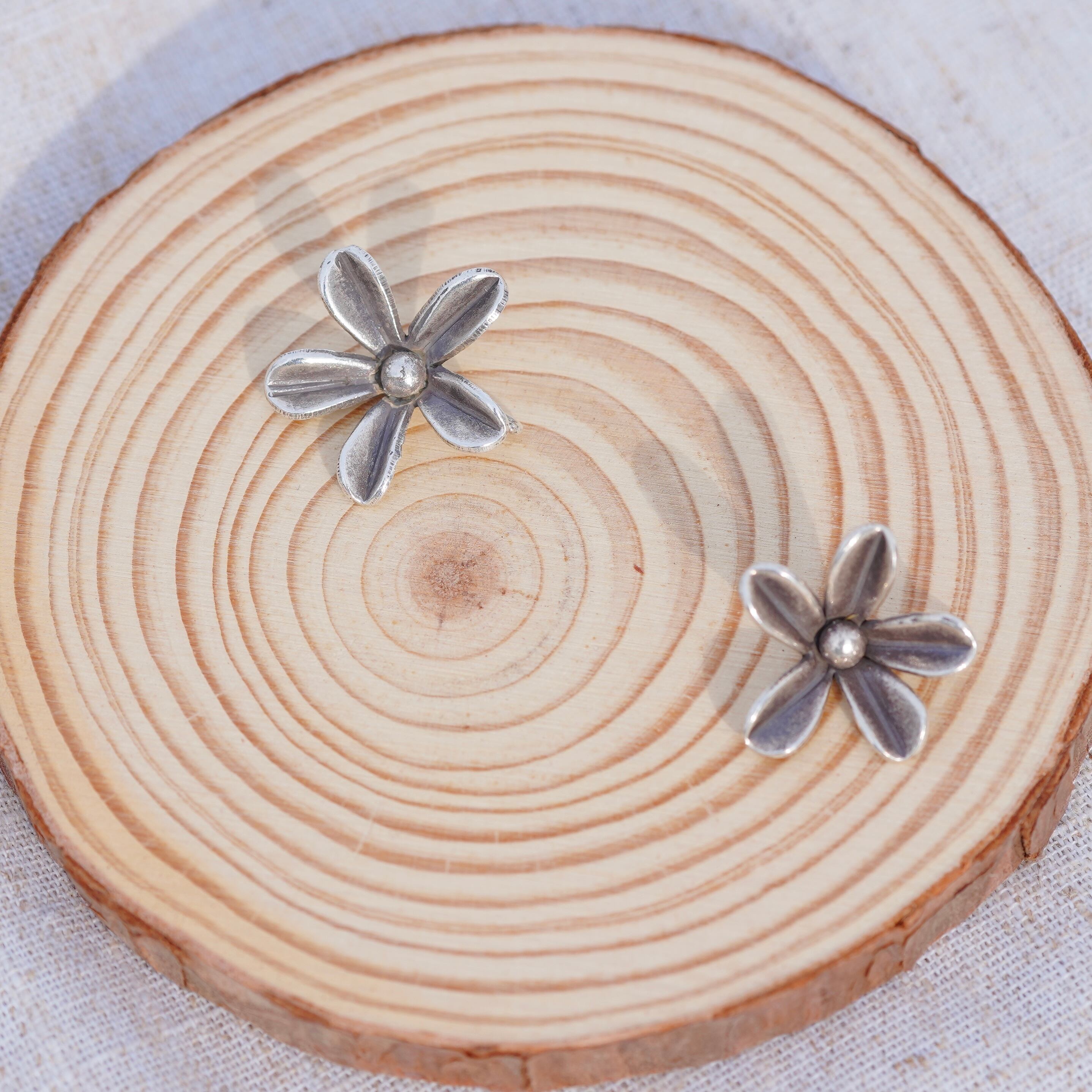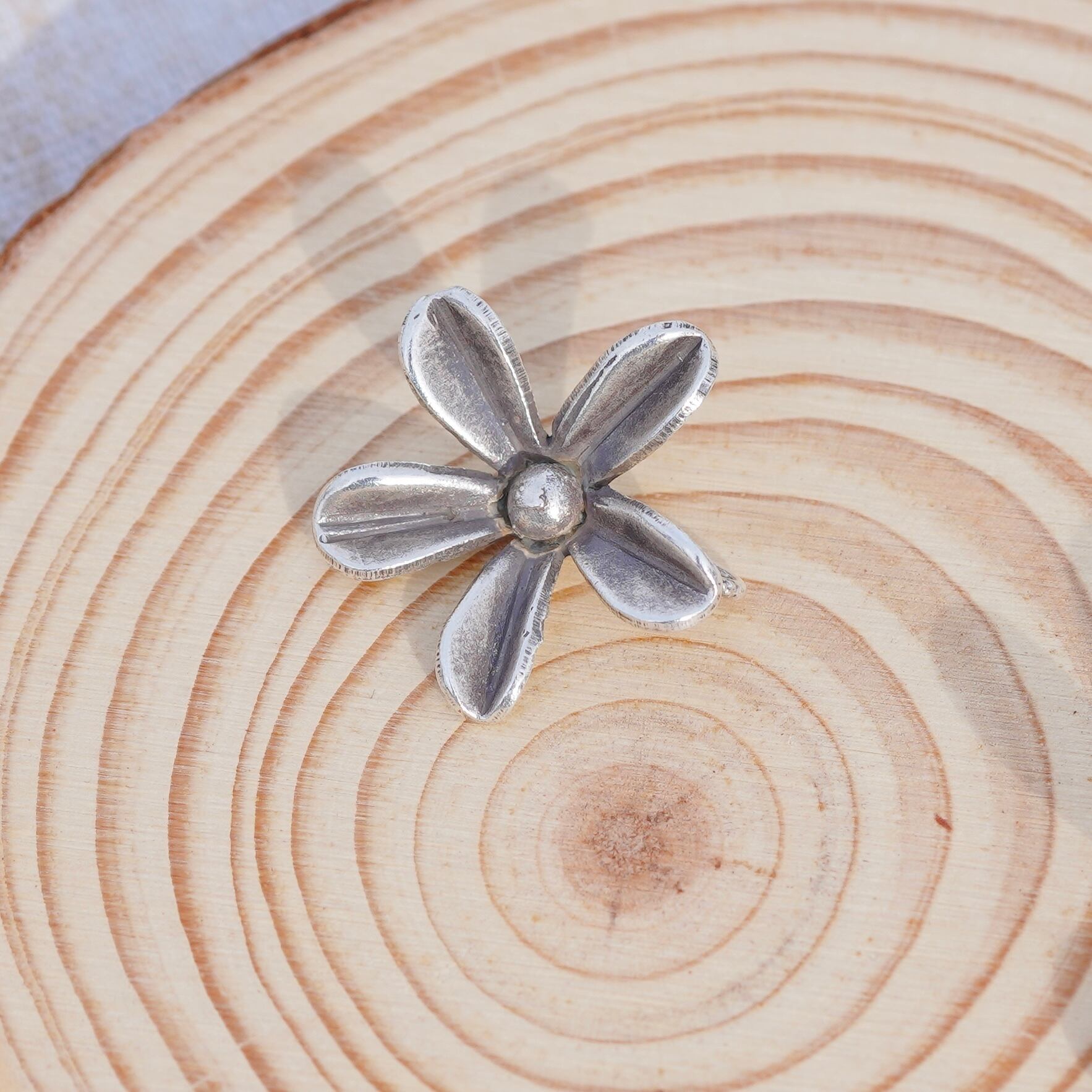立体的なお花の形をしたハンドメイドシルバーパーツ。手作りのため、大きさ・形に多少のばらつきがありますのでご了承お願い致します。