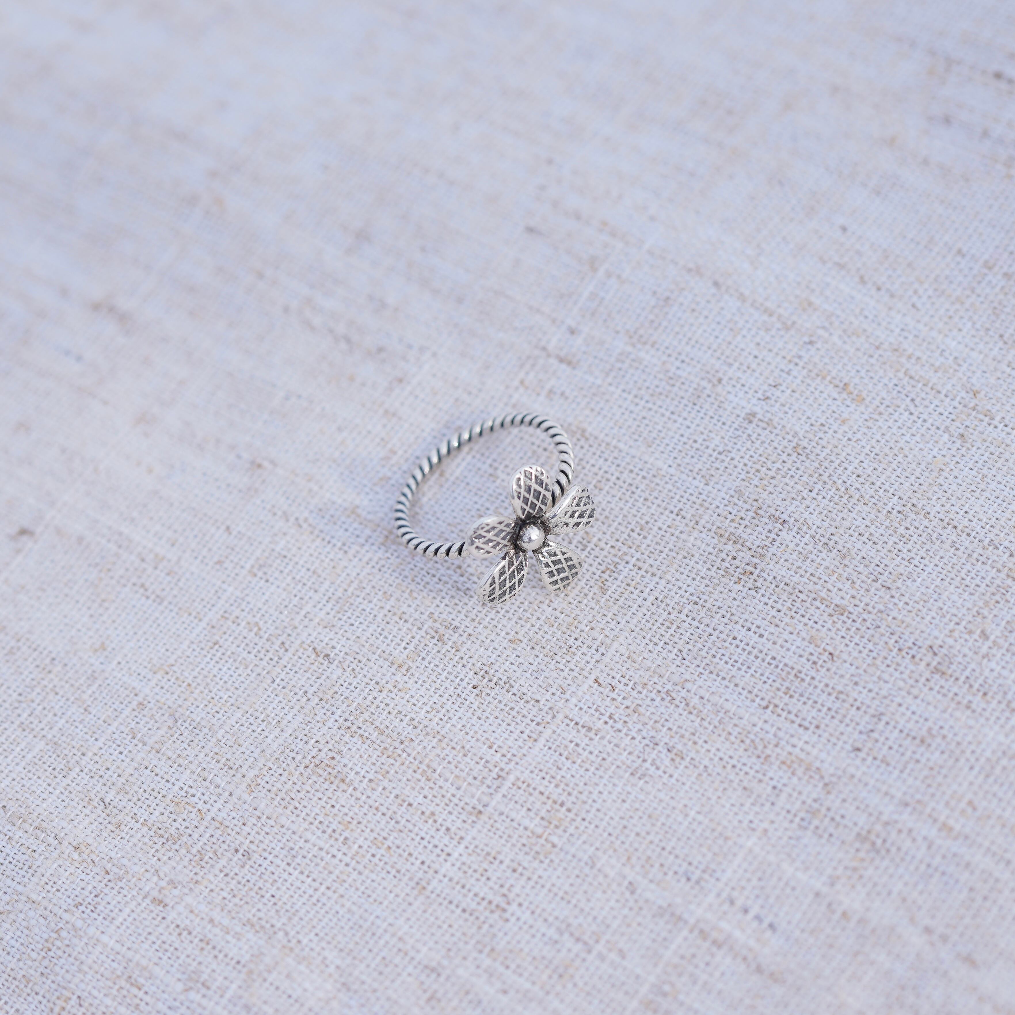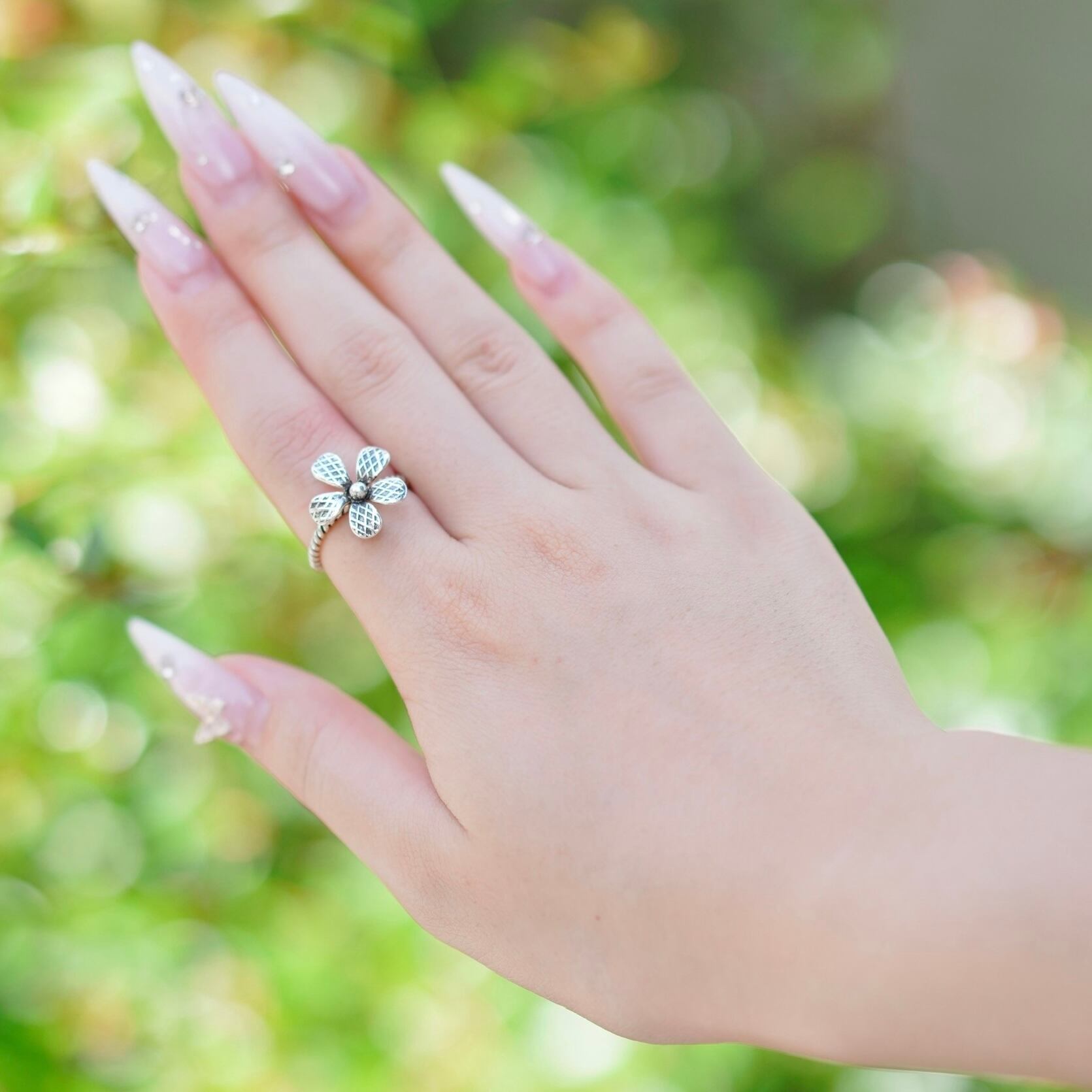軽い付け心地のお花が魅力のリングです。ぱっと目を惹くボリューム感ですが、付けやすいサイズ感です。