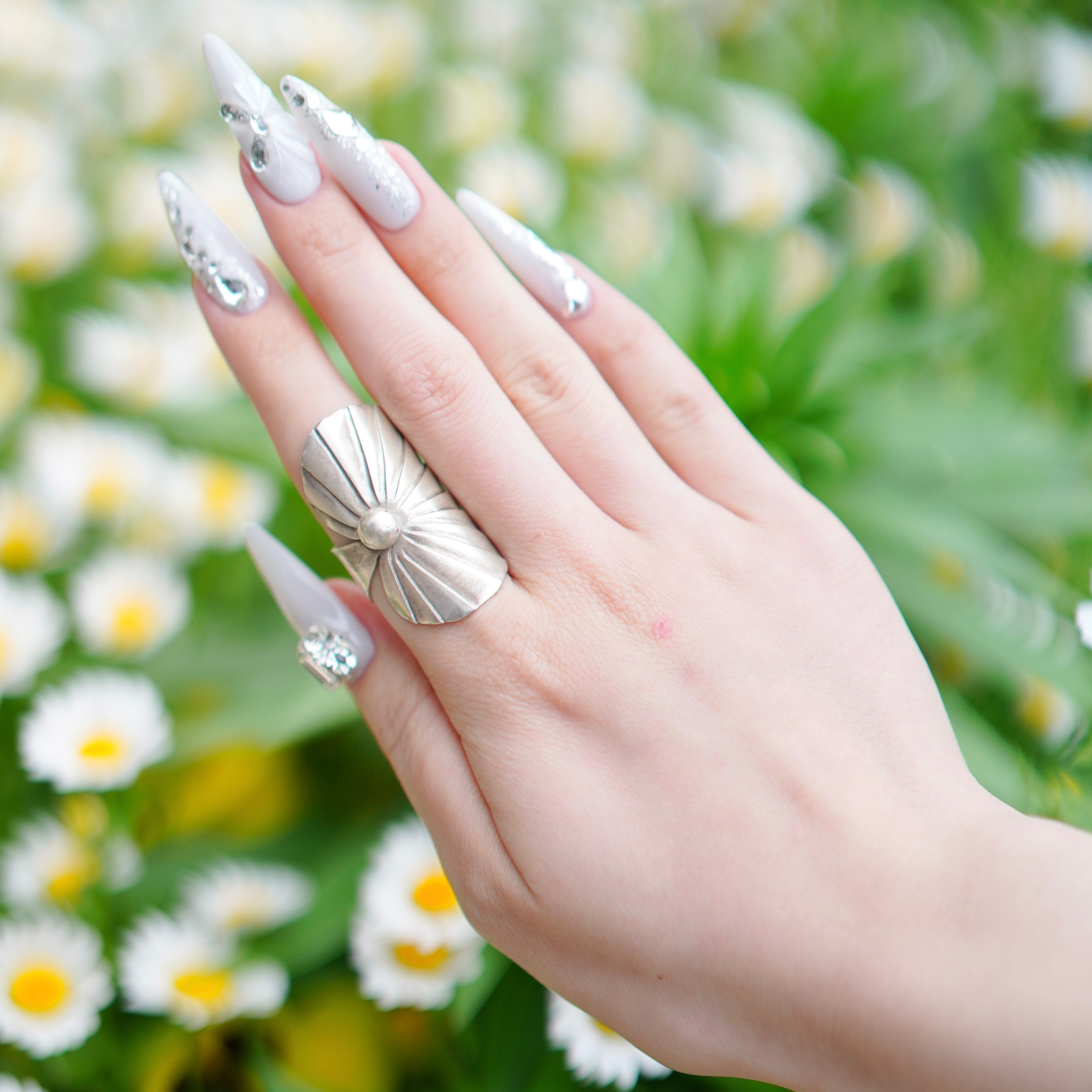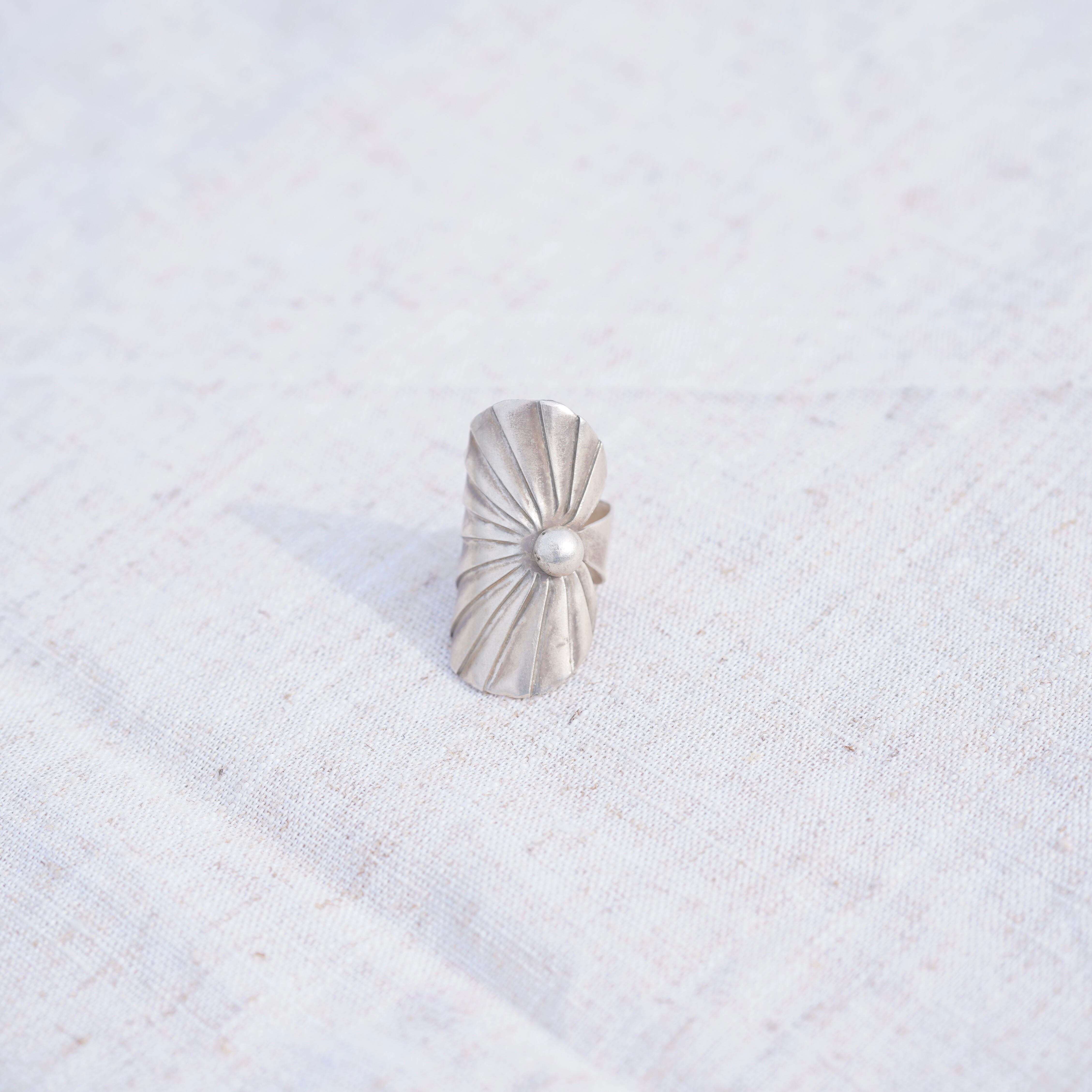 葉っぱモチーフのような大ぶりなシルバーリング。ぱっと目を惹くボリューム感ですが、軽い付け心地です。純度の高いシルバーを使用しておりやわらかい為、調整の際はお気を付け下さい。